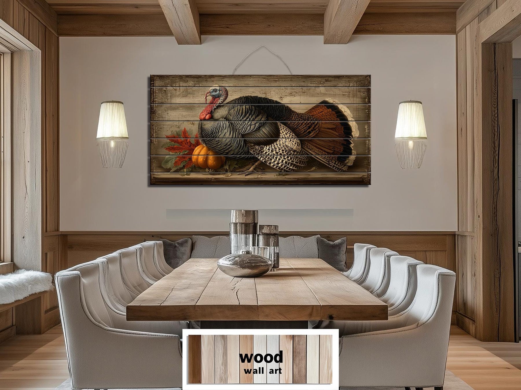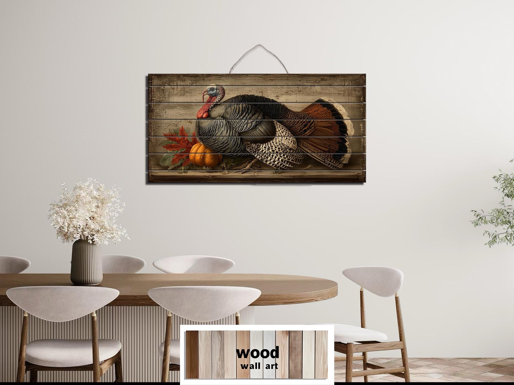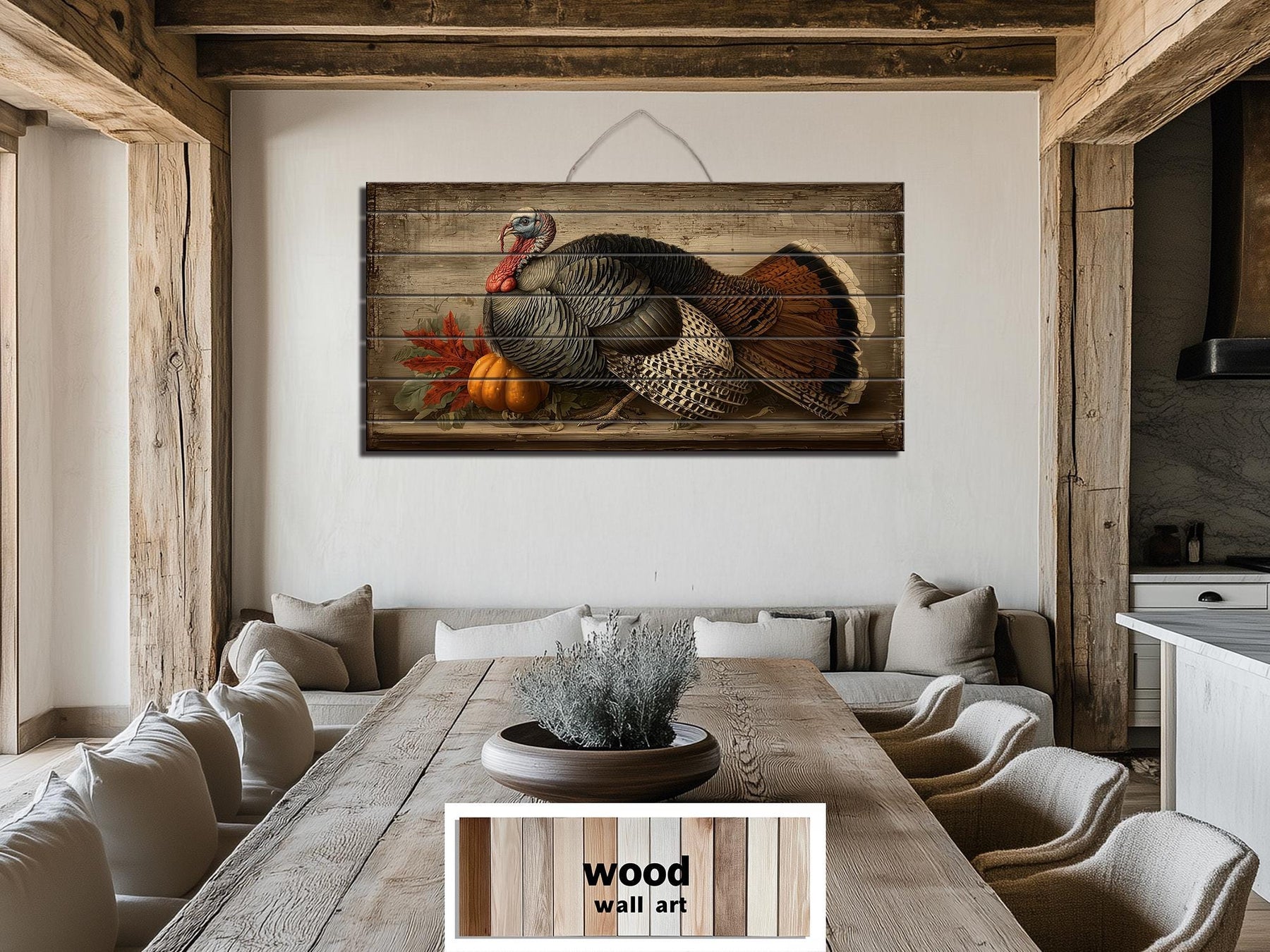 This Rustic Thanksgiving Turkey With Pumpkins distressed wood wall art is perfect for farmhouse dining rooms and traditional kitchens where family and friends gather for holiday meals. Its harvest imagery and classic composition pair beautifully with wooden tables, vintage hutches, and autumnal centerpieces. The horizontal design fits gracefully above sideboards, buffets, or large dining tables, anchoring the room with a sense of celebration and gratitude. In a farmhouse setting, it harmonizes with exposed beams, natural wood furniture, and earthy linens, creating an inviting backdrop for Thanksgiving festivities. The gently distressed wood finish provides an authentic vintage feel while maintaining the strength and longevity of new materials. Rich autumn colors and lifelike details make it a conversation starter and a visual focal point during holiday dinners. Whether featured alone or accompanied by seasonal garlands and candles, it enhances the warmth and meaning of family traditions. This Rustic Thanksgiving Turkey With Pumpkins painting blends artistry and heritage, ensuring it will be treasured for years to come. Add a touch of harvest abundance and timeless elegance to your celebrations with Rustic Thanksgiving Turkey With Pumpkins wall art.