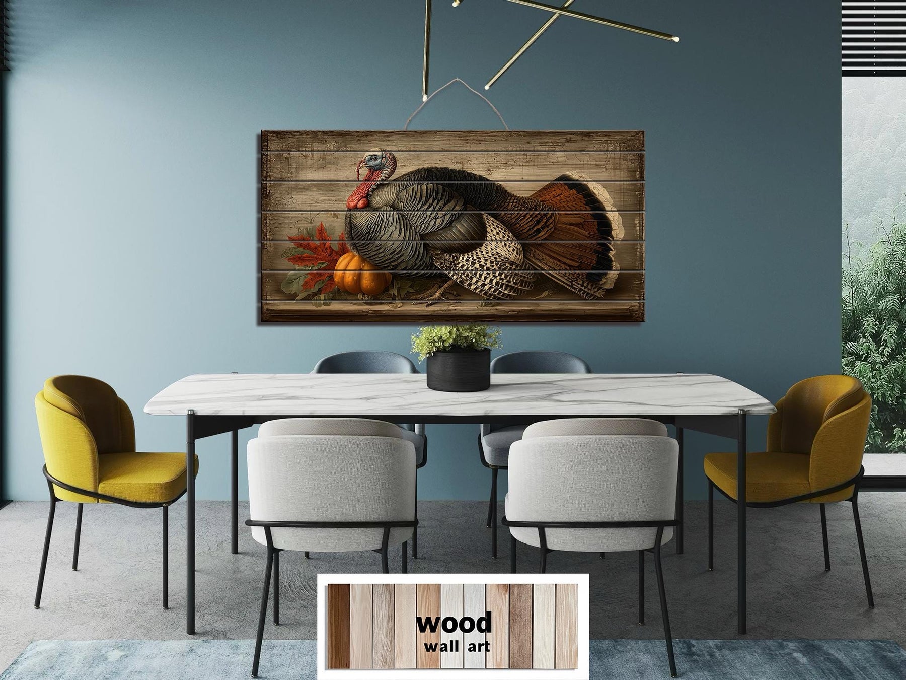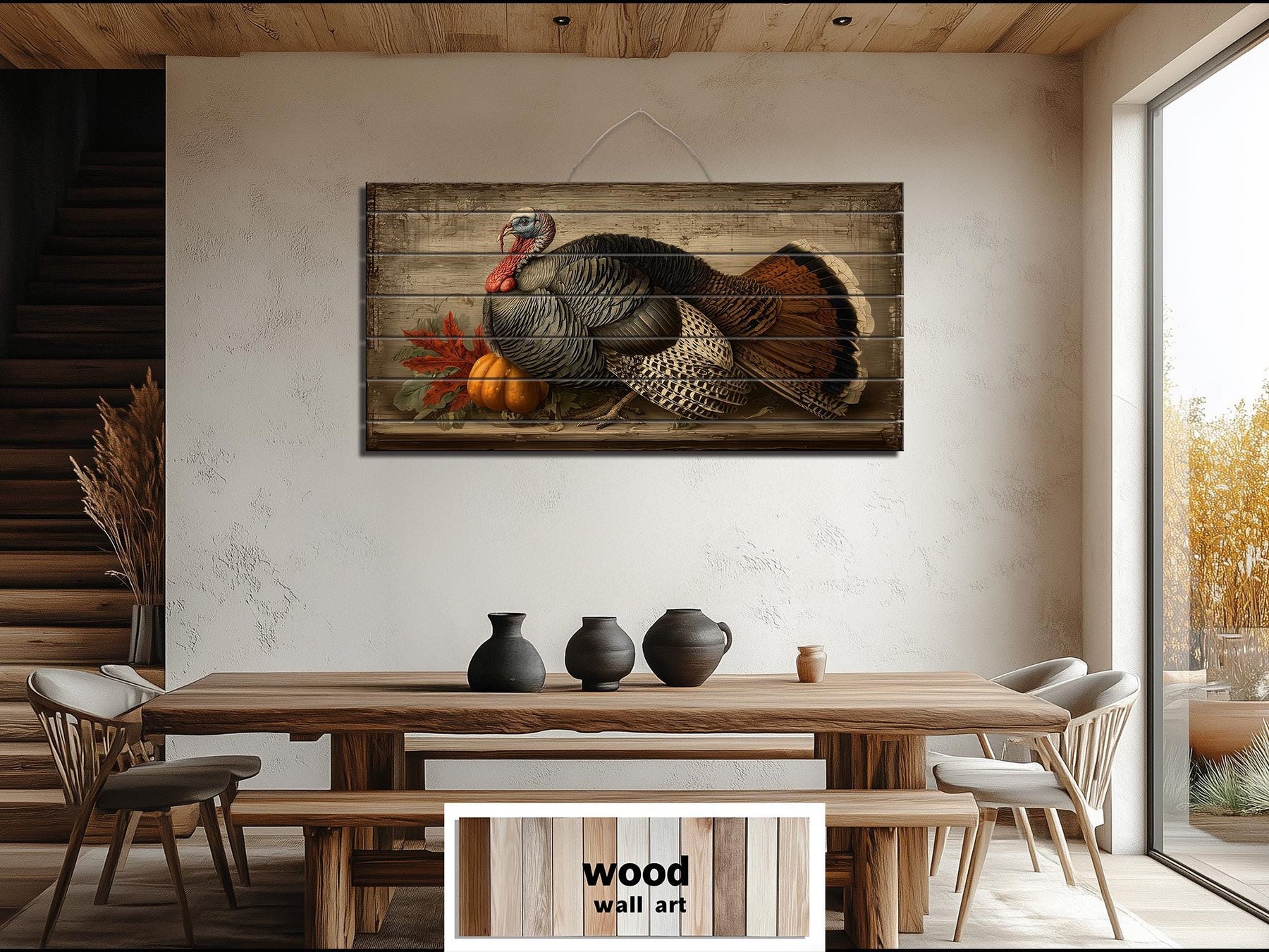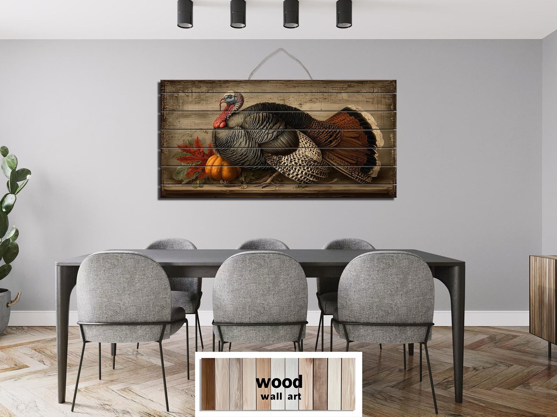 This Rustic Thanksgiving Turkey With Pumpkins distressed wood wall art is perfect for farmhouse dining rooms and traditional kitchens where family and friends gather for holiday meals. Its harvest imagery and classic composition pair beautifully with wooden tables, vintage hutches, and autumnal centerpieces. The horizontal design fits gracefully above sideboards, buffets, or large dining tables, anchoring the room with a sense of celebration and gratitude. In a farmhouse setting, it harmonizes with exposed beams, natural wood furniture, and earthy linens, creating an inviting backdrop for Thanksgiving festivities. The gently distressed wood finish provides an authentic vintage feel while maintaining the strength and longevity of new materials. Rich autumn colors and lifelike details make it a conversation starter and a visual focal point during holiday dinners. Whether featured alone or accompanied by seasonal garlands and candles, it enhances the warmth and meaning of family traditions. This Rustic Thanksgiving Turkey With Pumpkins painting blends artistry and heritage, ensuring it will be treasured for years to come. Add a touch of harvest abundance and timeless elegance to your celebrations with Rustic Thanksgiving Turkey With Pumpkins wall art.