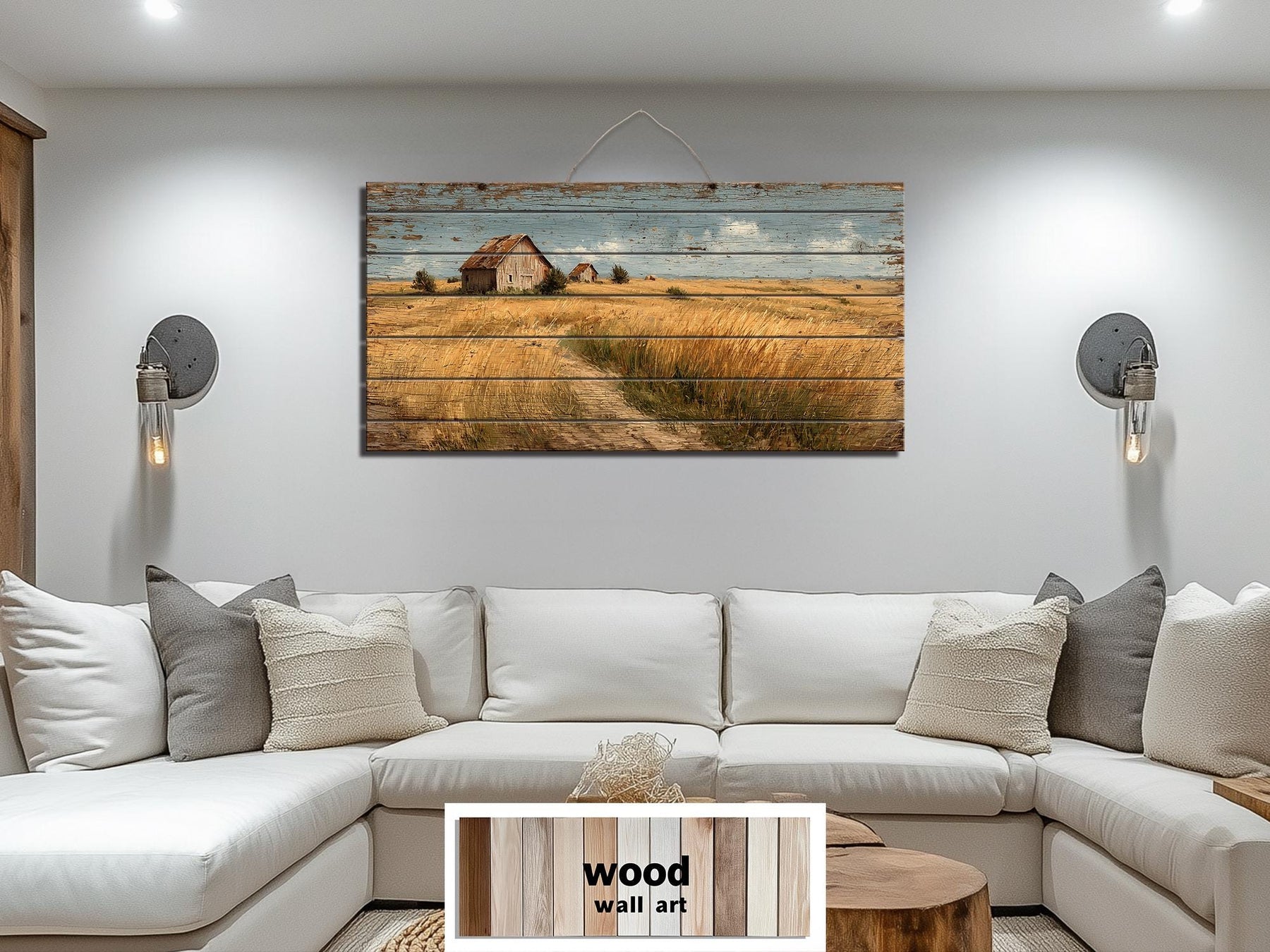 The color palette of this Rustic Wheat Field Barn painting radiates natural harmony and warmth, perfectly balancing earthy neutrals with touches of soft contrast. Golden wheat tones dominate the composition, blending seamlessly with muted beige and light brown shades that create depth and texture across the field. The barn itself features rich wooden hues — a mix of chestnut, oak, and aged gray — complementing the surrounding landscape with quiet strength. The sky above introduces a cool gradient of pale blue merging into soft white, evoking the feeling of a calm summer morning. Subtle shadowing adds realism and contrast, emphasizing the textures of both the barn’s weathered boards and the fine wheat details. The distressed wood background enriches the image with an authentic rustic texture that enhances its character and aged charm. This harmonious color scheme works effortlessly in homes that feature natural materials and neutral tones. Whether paired with cream walls, dark wood furniture, or stone accents, the palette of this distressed wood wall art creates a warm, inviting environment. Every hue has been carefully balanced to evoke the beauty and tranquility of a rustic farm landscape in timeless style.