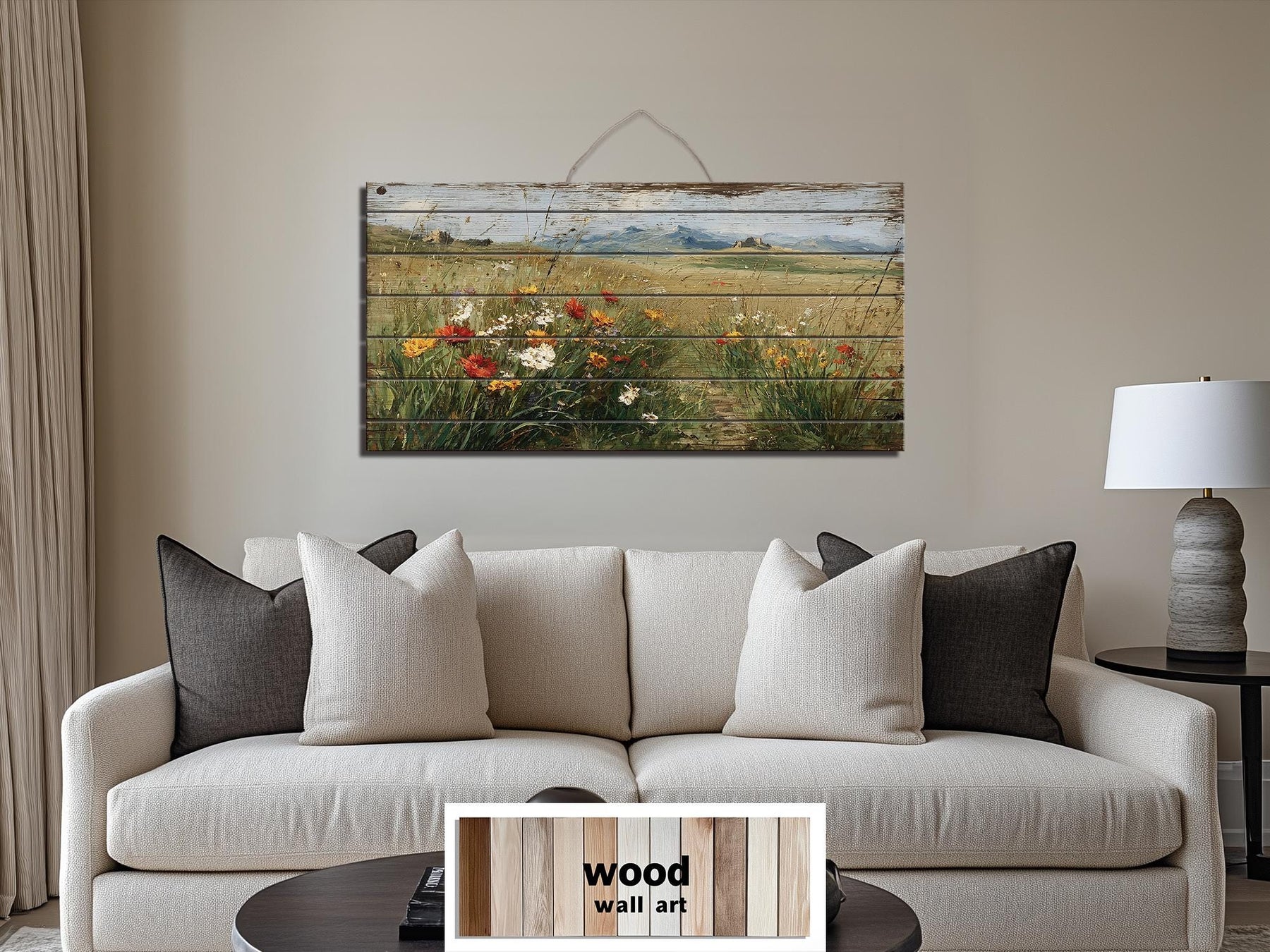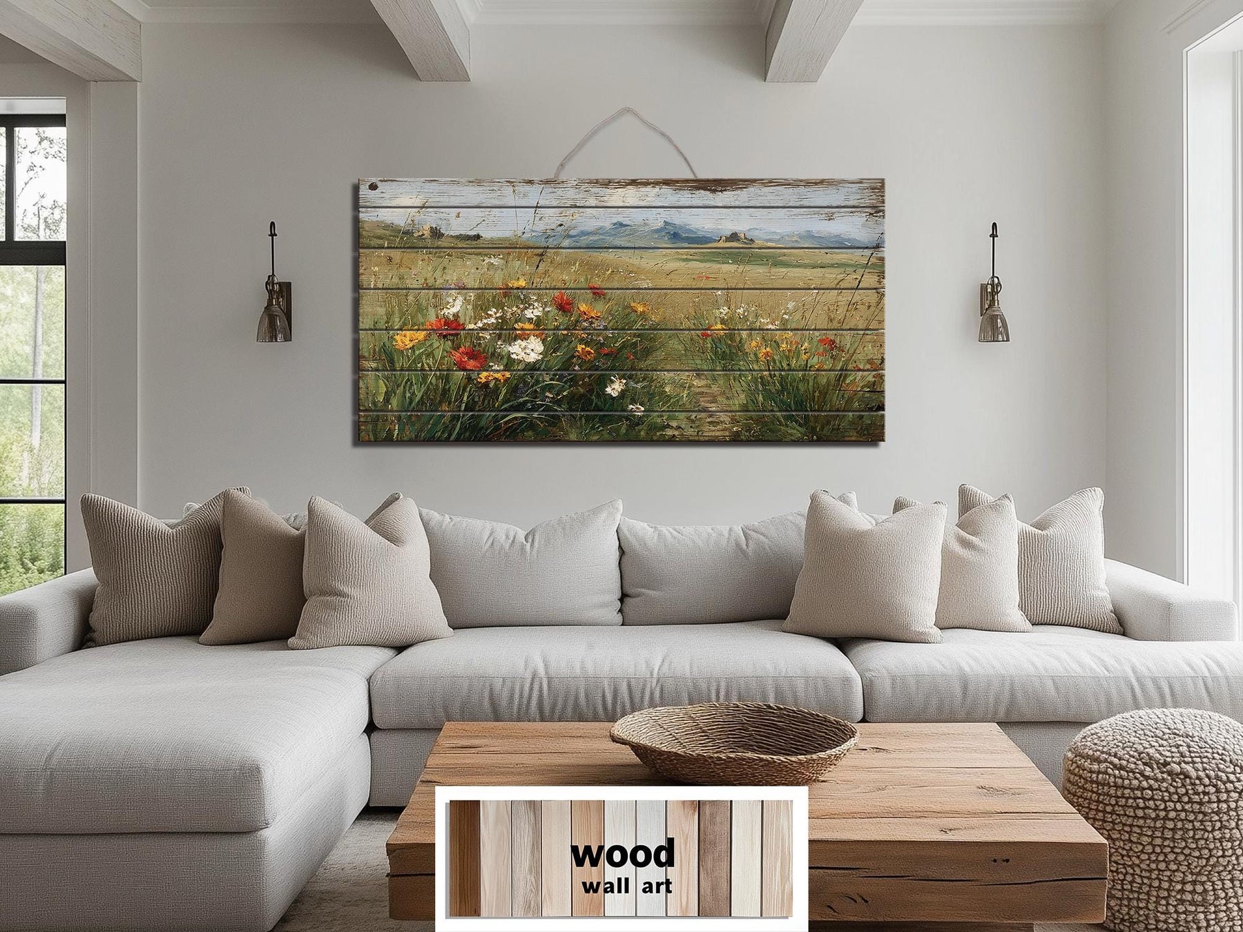 The Rustic Wildflower Field Distressed Wood Wall Art brings the gentle charm of the countryside into your home with an elegant, time-worn beauty. This stunning piece features a peaceful meadow filled with blooming wildflowers, their delicate petals swaying softly under the glow of afternoon sunlight. Hints of cream, white, yellow, and blush flowers emerge from soft green grass, creating a calming balance of texture and color. In the distance, the horizon fades into a light sky, giving the artwork a sense of openness and tranquility. The design is printed directly on new wood with a distressed finish that mimics the appearance of age, allowing the natural wood grain to enhance its rustic character. Each detail—from the brush-like strokes of the flowers to the soft blending of tones—adds a handcrafted feel to this serene composition. Perfectly combining artistry and natural simplicity, this piece embodies the quiet beauty of an untouched field. The Rustic Wildflower Field Distressed Wood Wall Art evokes feelings of peace, nostalgia, and warmth, making it an ideal centerpiece for farmhouse, rustic, or nature-inspired homes.