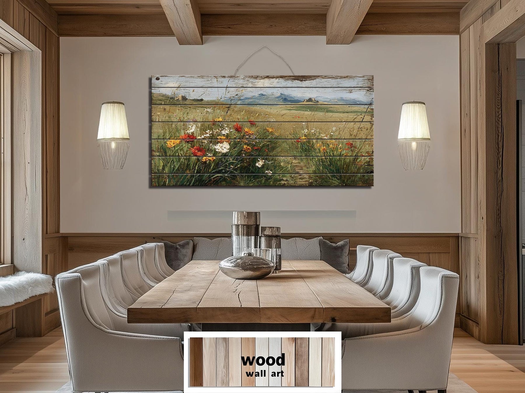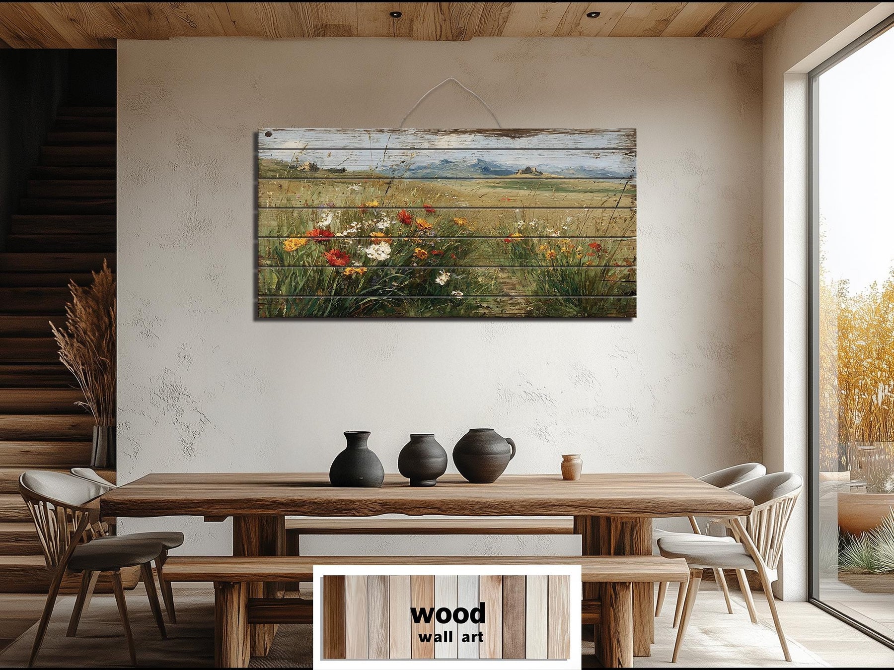 This Rustic Wildflower Field Distressed Wood Wall Art was designed to complement interiors that blend simplicity with warmth, such as farmhouse, rustic, and country-inspired spaces. Its natural palette and weathered finish make it ideal for living rooms, bedrooms, dining areas, or entryways seeking an inviting focal point. When hung above a bed, sofa, or mantel, it infuses the room with a gentle serenity that feels organic and effortless. In farmhouse settings, it pairs beautifully with wooden beams, linen fabrics, and soft neutral furnishings, enhancing the cozy, lived-in charm of the decor. In modern rustic homes, it adds texture and depth, bridging clean lines with natural character. The horizontal orientation makes it easy to style as a statement piece, while its distressed surface ensures it feels at home among reclaimed wood or antique finishes. Every detail, from the warm tones to the visible grain, captures the authenticity of handcrafted art printed on new wood with a vintage look. Built to endure while radiating timeless simplicity, the Rustic Wildflower Field Distressed Wood Wall Art transforms any room into a peaceful retreat inspired by the beauty of nature.