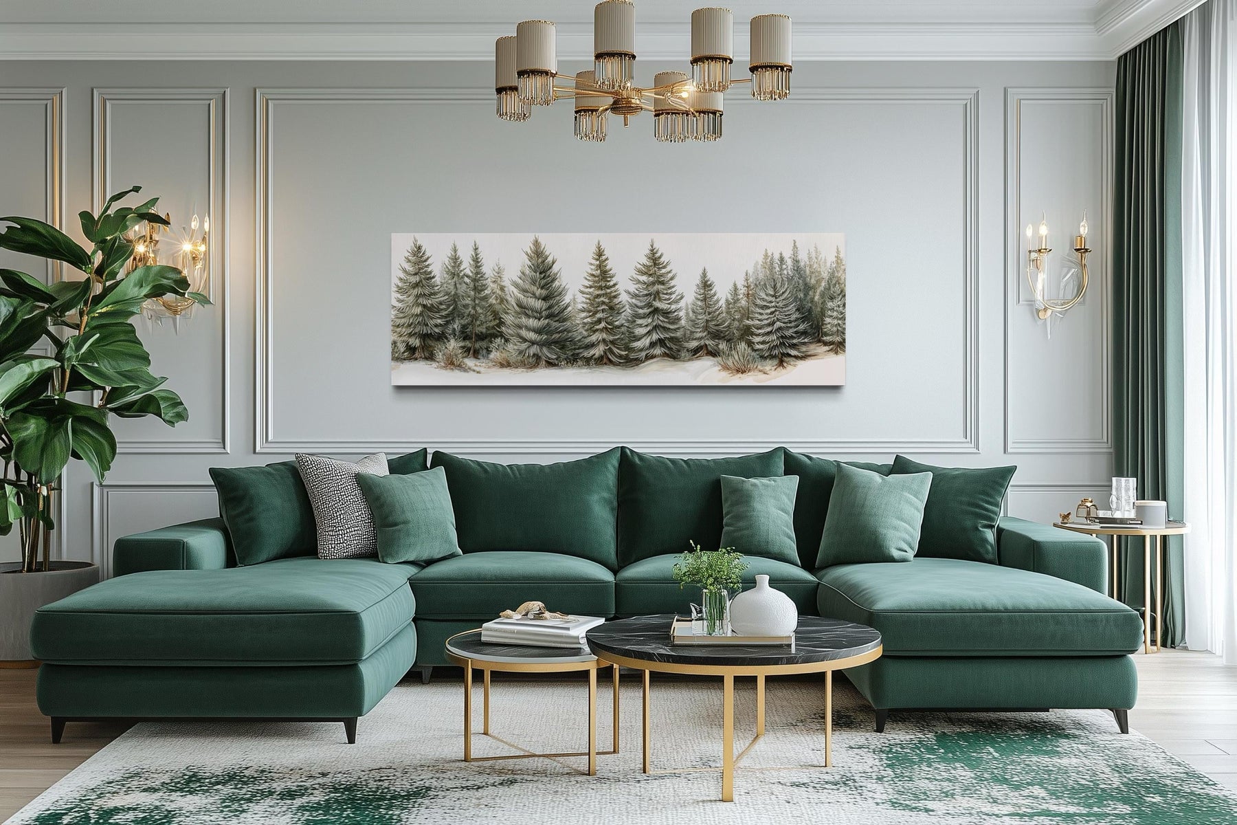 Panoramic canvas wall art featuring a row of sage green pine trees above a modern living room sofa.