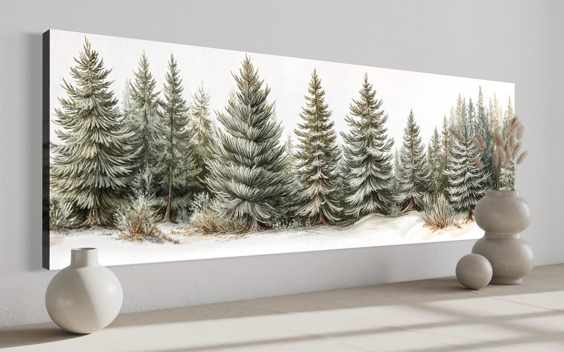 Our Sage Green Pine Trees Wall Art is a panoramic canvas print that presents a tranquil line of evergreen pines stretching across a wide forest landscape. The composition shows tall conifer trees standing quietly side by side, forming a peaceful woodland horizon that runs from one end of the artwork to the other. Each pine is illustrated with layered branches that taper naturally upward, creating the recognizable triangular shape of classic northern forest trees. The arrangement feels balanced and orderly, giving the scene a calm and grounded presence. The trees appear as a continuous forest edge, suggesting a distant woodland resting beyond open land. Soft painterly detail gives texture to the needles and branches while preserving a clean decorative appearance. The wide format allows the forest to unfold gradually across the canvas, encouraging the eye to move slowly through the line of trees. Gentle spacing between the pines adds rhythm to the scene and prevents the forest from feeling crowded. This Sage Green Pine Trees Wall Art painting captures the quiet stillness of evergreen woods through a simple and elegant forest landscape design.