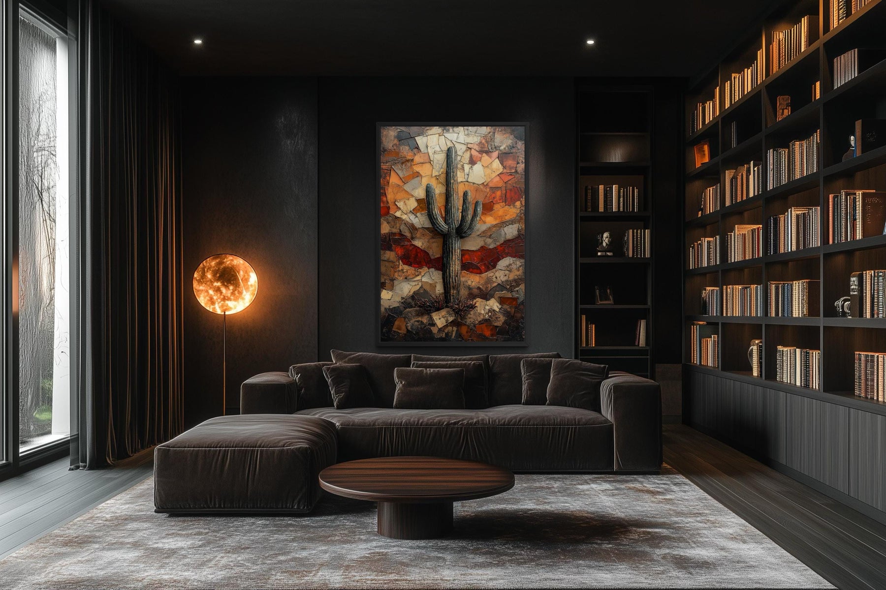 This Saguaro Cactus Wall Art works especially well in interiors inspired by southwestern design or rustic desert themes. The vertical composition makes the artwork ideal for narrower wall spaces where tall artwork naturally fits. Living rooms with warm neutral furniture pair beautifully with the earthy desert tones of the scene. The cactus subject introduces a strong natural element that complements wood furniture, leather seating, and warm textured fabrics. In southwestern or desert-inspired interiors, the cactus imagery reinforces the natural theme of the space. The artwork also adds visual interest to entryways, hallways, or accent walls that benefit from a tall decorative focal point. Rooms designed with warm tones and natural materials feel balanced when paired with desert landscape artwork. The cactus silhouette gives the room a distinctive southwestern character without overwhelming the surrounding decor. Interiors that incorporate earthy colors and nature-inspired accents feel especially cohesive with this Saguaro Cactus Wall Art canvas print displayed as a bold decorative feature.