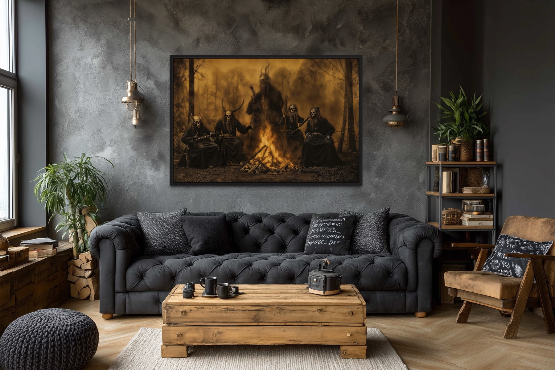 The color palette of this satanic ceremony wall art is dominated by deep, moody hues that accentuate its gothic theme. Dark shades of black and charcoal create a brooding background, while subtle hints of crimson and deep burgundy add an ominous glow, reminiscent of ritualistic flames. The use of muted gold and bronze tones further enhances the artwork, giving it an antique feel that complements its rustic elements. This blend of colors creates a powerful contrast that draws attention to the central figures and symbols within the piece. The overall effect is both dramatic and eerie, perfectly capturing the essence of a satanic ceremony painting. The rich, dark tones make this canvas print a striking addition to any space seeking a bold statement piece.