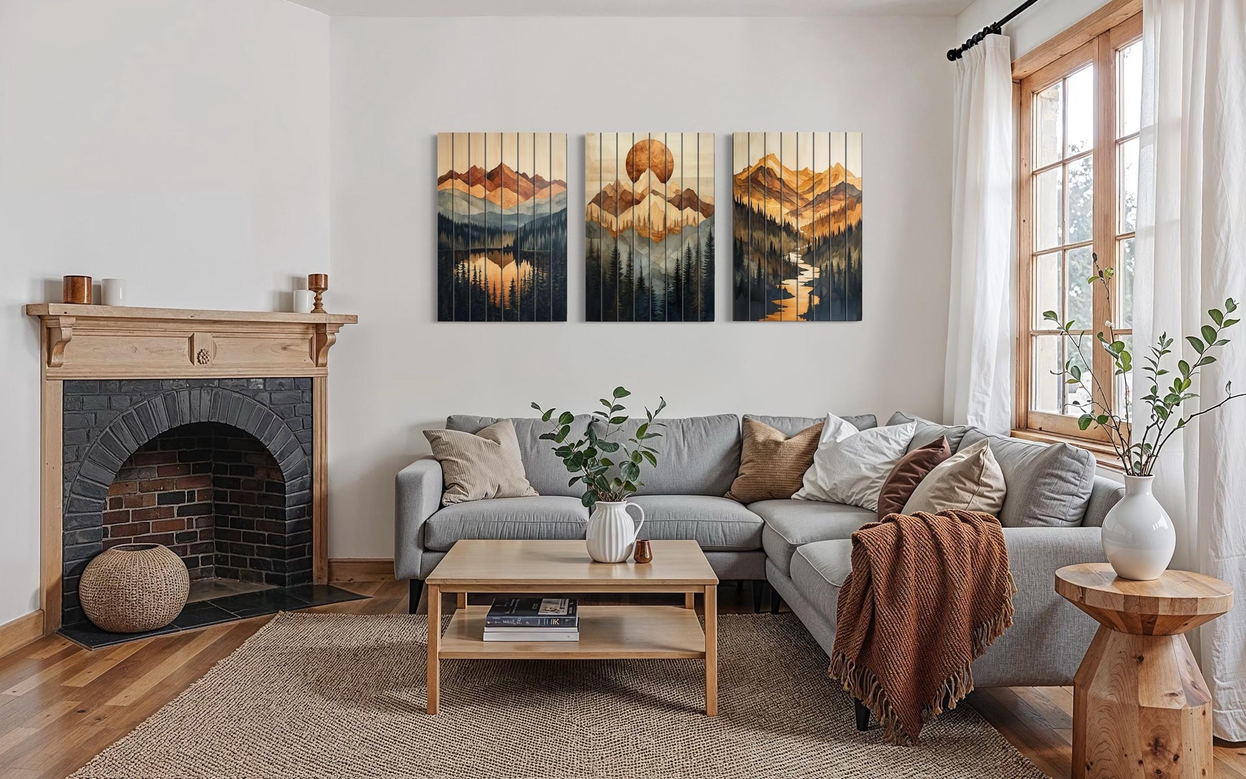 This mountain triptych is perfect for cabins, lodges, or rustic living spaces where natural textures and outdoor themes take center stage. It adds expansive visual depth to rooms with natural wood furniture, stone fireplaces, and cozy layered textiles in wool, leather, or linen. Ideal for spaces where you want to bring the grandeur of the outdoors inside, this piece pairs beautifully with Western, lodge, or adventure-themed interiors. The warm tones make it especially suited to spaces that rely on amber lighting, exposed beams, and handcrafted furnishings. Whether you hang it above a couch, a long entryway bench, or a dining table with a reclaimed wood top, this artwork commands attention while blending into the environment with ease. For those curating a room that tells a story of wilderness, hiking, or highland memories, this art set becomes a bold yet harmonious centerpiece. Its size and layout make it well-suited for long horizontal walls or areas in need of a strong visual anchor. It offers calm for a reading nook, character for a game room, or heritage appeal for a vacation rental in the mountains. The print style, coloring, and texture all lend themselves to rugged, lived-in decor. This is the ideal finishing piece for anyone drawn to mountain sunset wall decor.