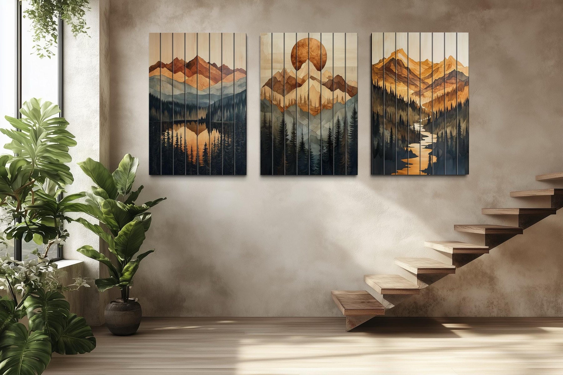 Set of 3 Mountain Sunset Landscape Rustic Distressed Wood Wall Art