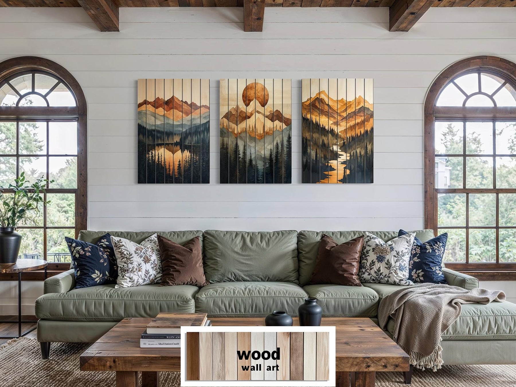 Our set of 3 mountain sunset landscape rustic distressed wood wall art captures the golden-hour magic of high-altitude wilderness across a stunning triptych format. The central panel features a towering mountain peak basking in the final light of day, its rugged slopes glowing in radiant orange, gold, and soft coral pink. On either side, the flanking panels continue the panoramic view, stretching the horizon into layers of alpine ridges, forested valleys, and distant silhouettes. Each panel is printed on real wood planks, where the natural grain and knots peek through, enhancing the earthy texture and giving the artwork a handcrafted, weathered appearance. The painted surface is intentionally distressed, with soft fading, chipped paint effects, and subtle wear that give the piece the feeling of a cherished heirloom or salvaged lodge decor. Mist swirls at the mountain’s base in gentle sweeps of blue-gray and peach, offering a sense of movement and serenity. The sky fades from warm firelight at the horizon into a cooler twilight wash, capturing the exact moment where day transitions into dusk. The composition has strong horizontal lines but is broken by vertical elements like pine trees and cliff edges, creating balance and visual rhythm across the set. When hung side by side, the three panels tell a single immersive story of wilderness majesty. This sunset mountain landscape wall decor brings panoramic mountain beauty into your space with rugged warmth.