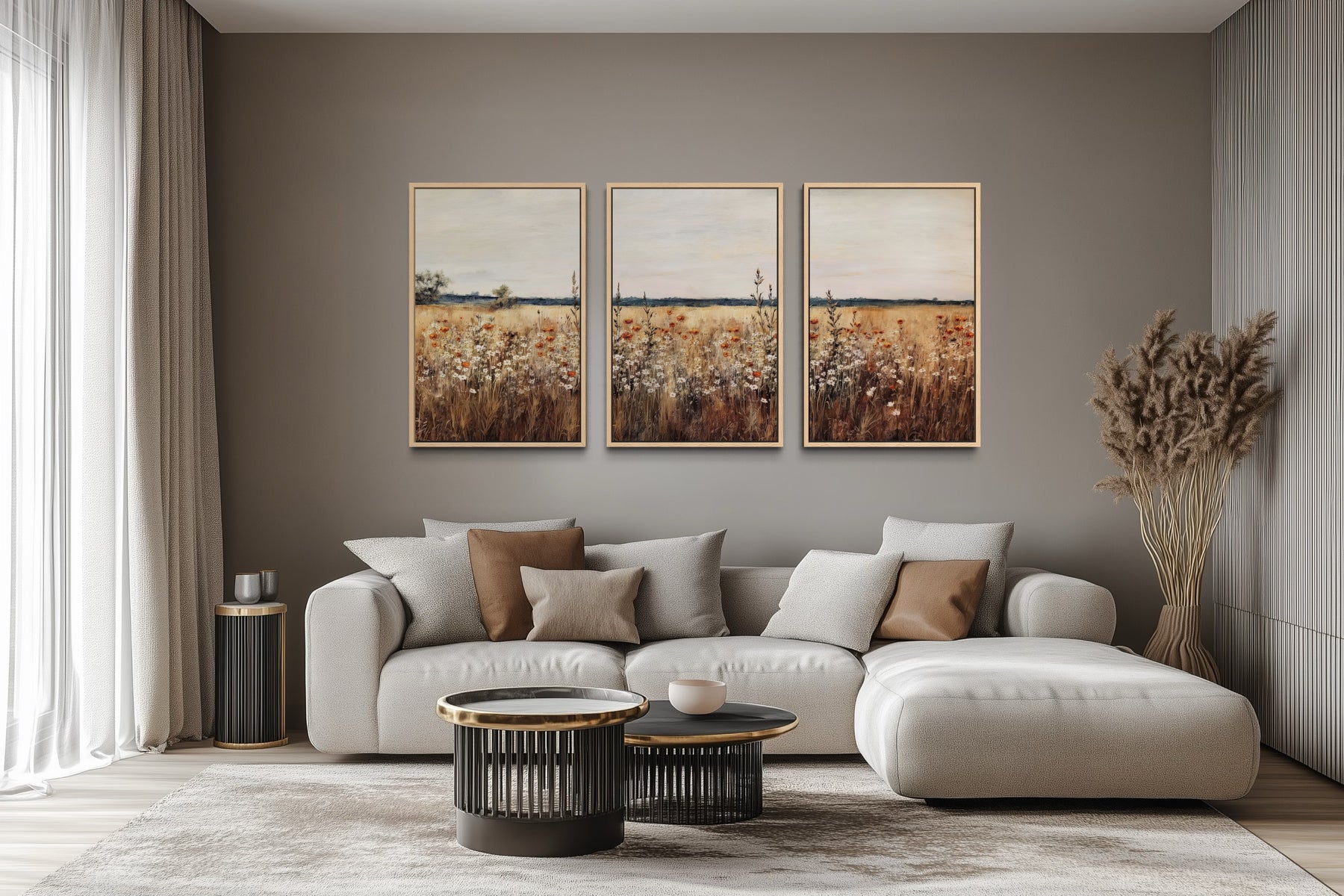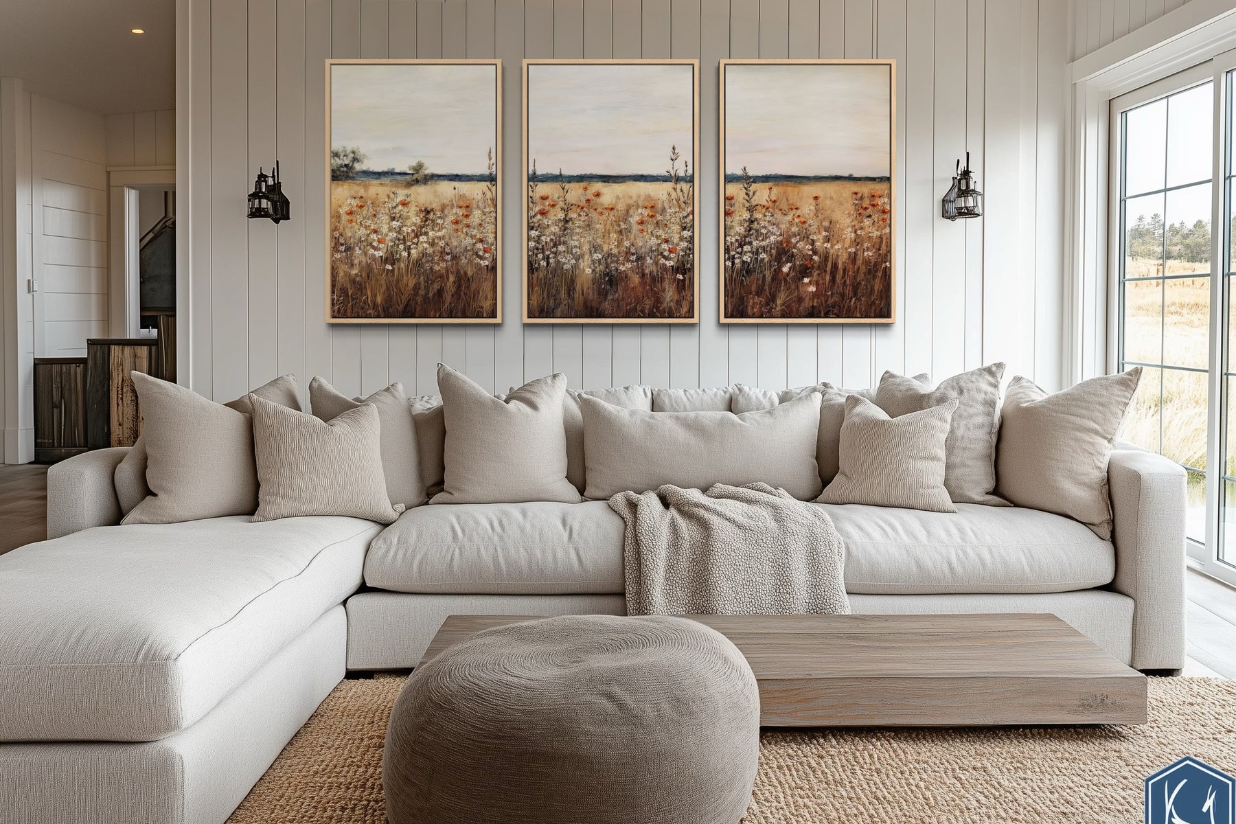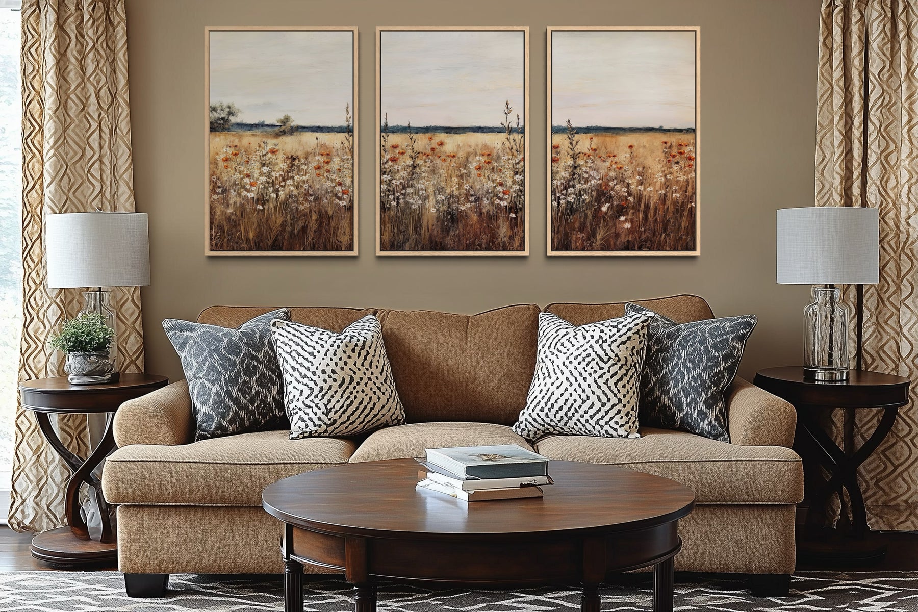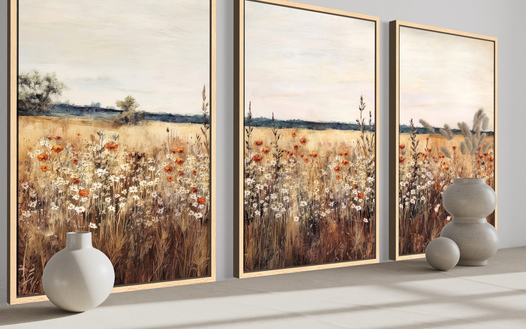 This set is made specifically for farmhouse living rooms, cozy cottage bedrooms, rustic entryways, and warm country-style dining areas where natural materials and soft textures define the mood. It complements spaces built around reclaimed wood, neutral upholstery, woven accents, and matte finishes instead of metal or glass. The three-piece format works perfectly above long dressers, benches, mantel shelves, or a sofa where width matters more than height. It is also an ideal fit for guest rooms, reading corners, and farmhouse kitchens, adding warmth without overwhelming the space. This is not décor for industrial lofts, neon modern homes, or bold graphic interiors—its purpose is to soften a room, not energize it. People who love vintage linens, handmade ceramics, and botanical artwork will instantly recognize the authenticity in the floral style. The artwork also offers a nature-based alternative to signs, text prints, or overly trendy wall pieces. Its gentle subject matter makes it a quiet focal point that feels like part of the home, not just decoration. For anyone wanting a calm, welcoming, farmhouse-inspired wall display, nothing fits more naturally than Wildflowers canvas print.