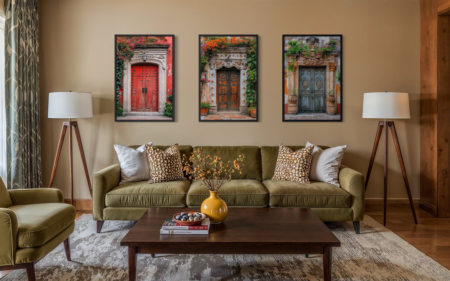 Our Mexican doors canvas wall art brings the charm and history of Mexico’s architectural beauty to your space. This set of three framed canvas prints showcases intricately designed traditional doors, each one telling a unique story through its craftsmanship and vibrant colors. From weathered wood to iron detailing, these artworks celebrate the artistry and cultural significance of Mexican design. The textured details and bold hues add character, while the timeless aesthetic blends tradition with sophistication. Perfect for creating a focal point in any room, these prints honor the beauty of Mexican doorways while adding a touch of rustic elegance. Whether displayed together or spread throughout your home, they create a cohesive and meaningful atmosphere. Bring warmth and history to your decor with this striking set of Mexican doors canvas wall art.