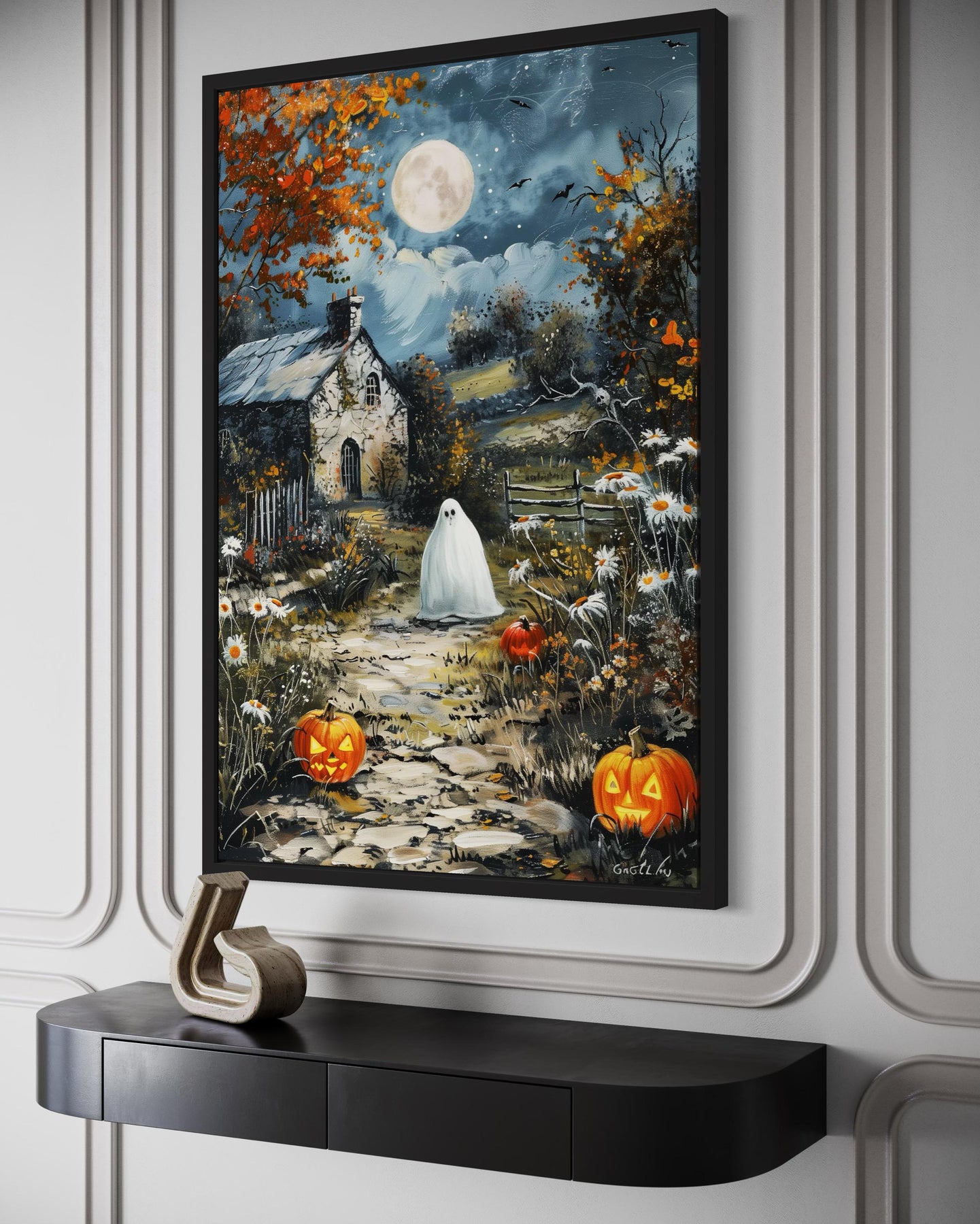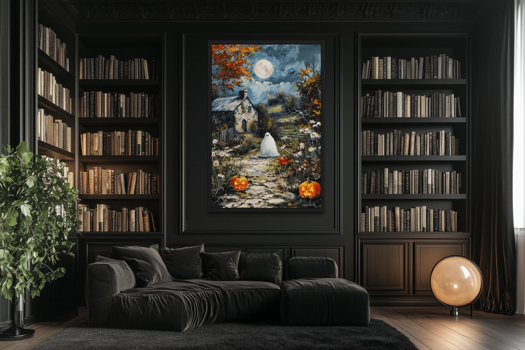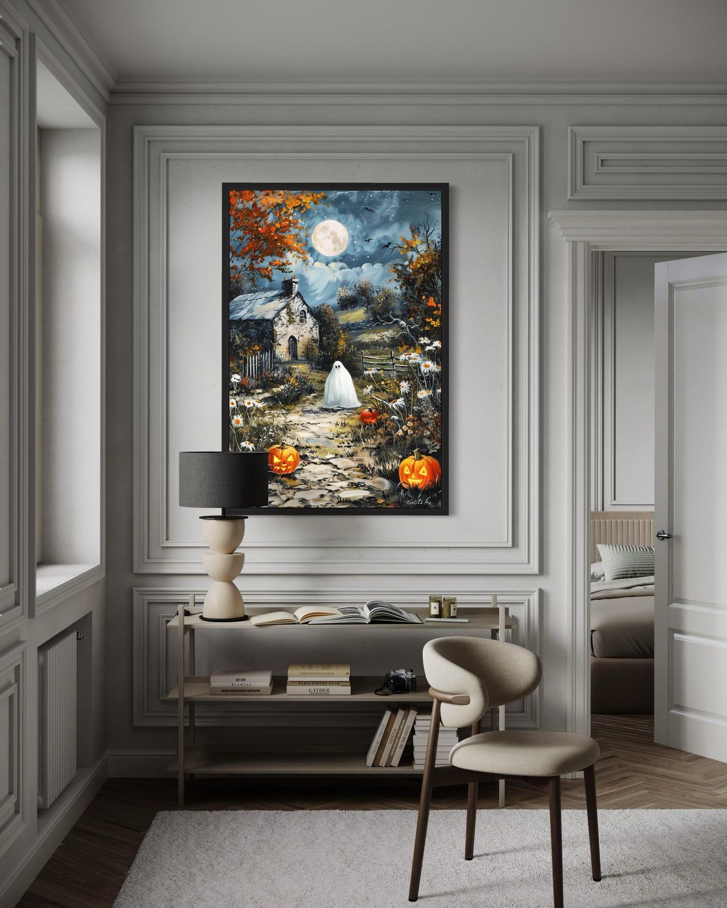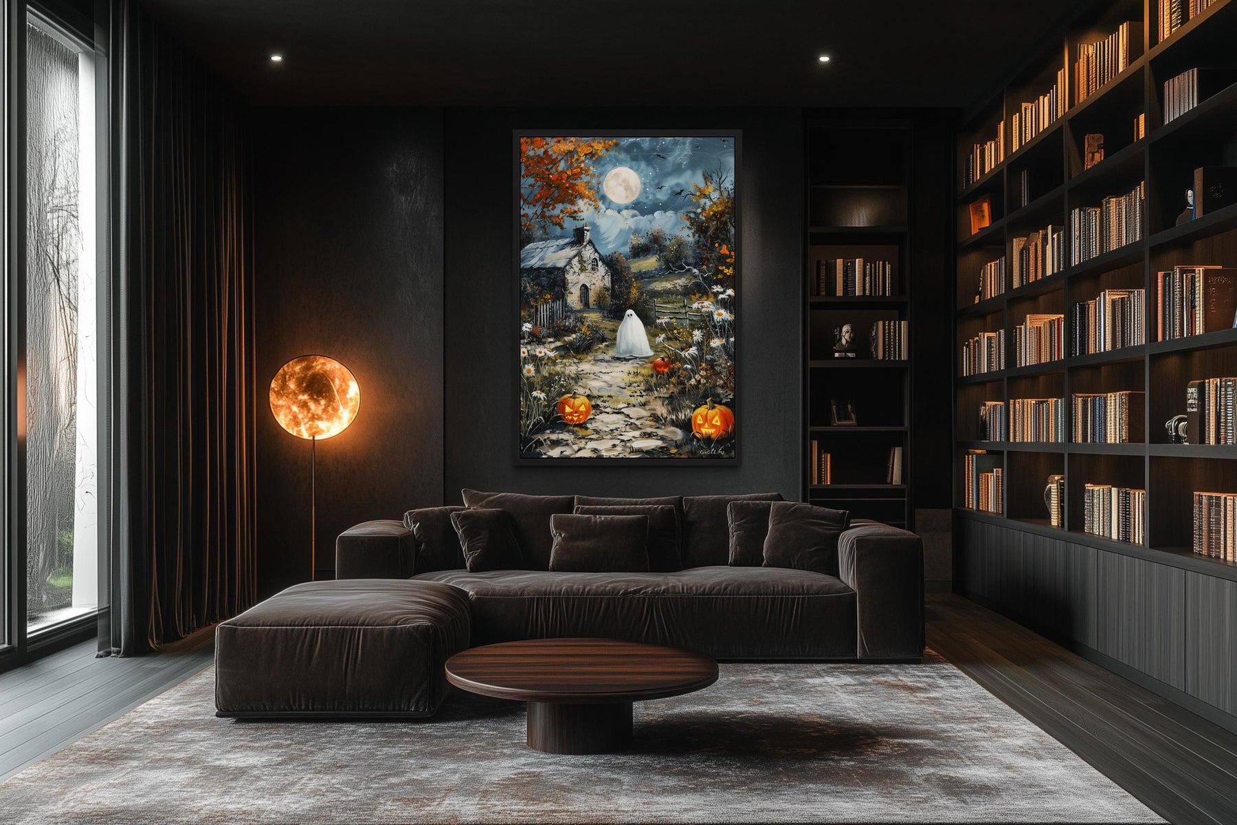 The color palette of this Halloween canvas print is carefully composed to capture the contrast between autumn warmth and supernatural coolness. The ghost glows in pale whites and smoky grays, standing out dramatically against the darker tones of the night. Pumpkins provide vibrant accents in deep orange, golden yellow, and muted amber, their warmth lighting the path with a festive yet eerie glow. The surrounding trees are painted in earthy browns and dark charcoals, anchoring the scene with rustic natural tones. Above, the sky is a canvas of deep navy and midnight blue, setting the stage for the luminous full moon to shine. The moon itself radiates ivory and silver, casting reflections across the leaves and mist, highlighting the textures of the ground and branches. Subtle highlights of bronze and sienna in the foliage add richness, evoking the essence of autumn while softening the gothic atmosphere. Mist and shadows in smoky gray tones stretch across the path, giving the piece atmospheric depth that feels both haunting and serene. This careful interplay of warm and cool tones ensures the piece works equally well in rustic or gothic-inspired spaces. The result is a palette that is instantly recognizable as seasonal while maintaining elegance, making this spooky ghost wall art an unforgettable addition to Halloween decor.
