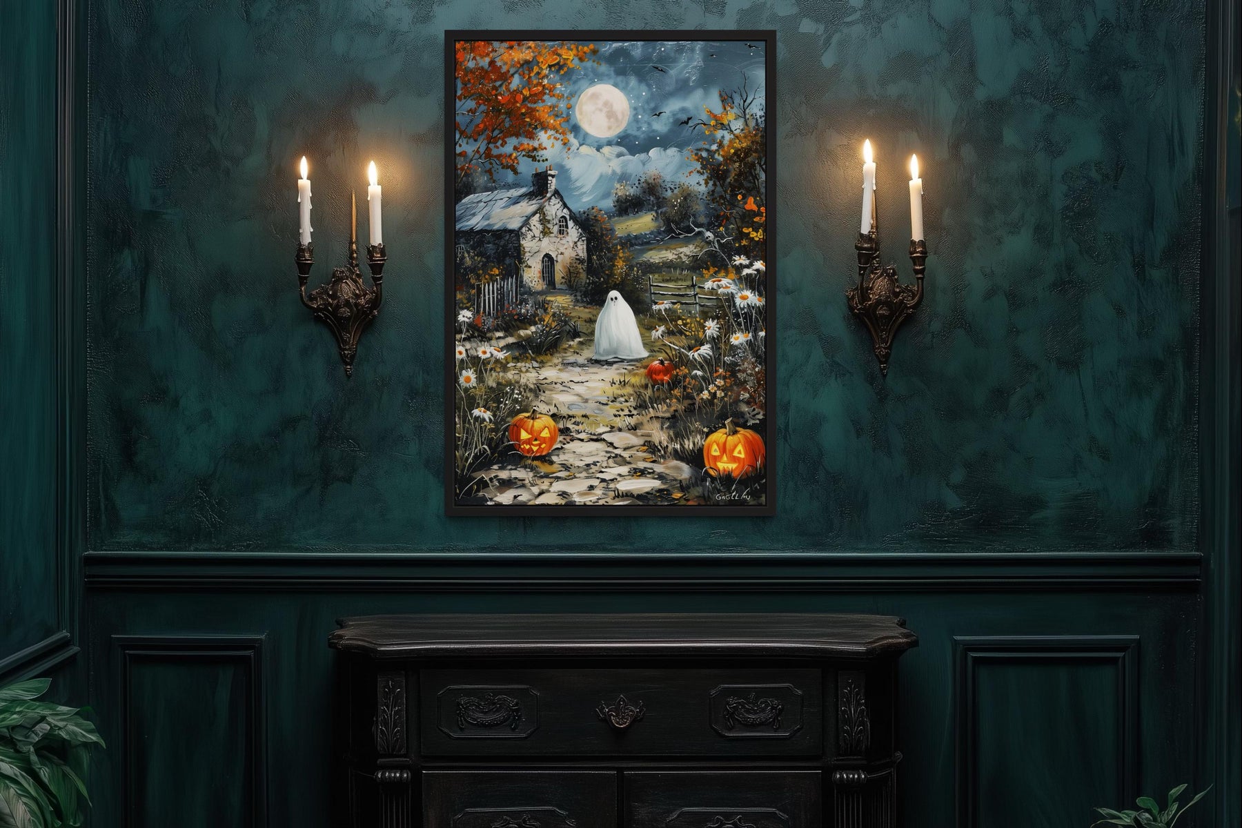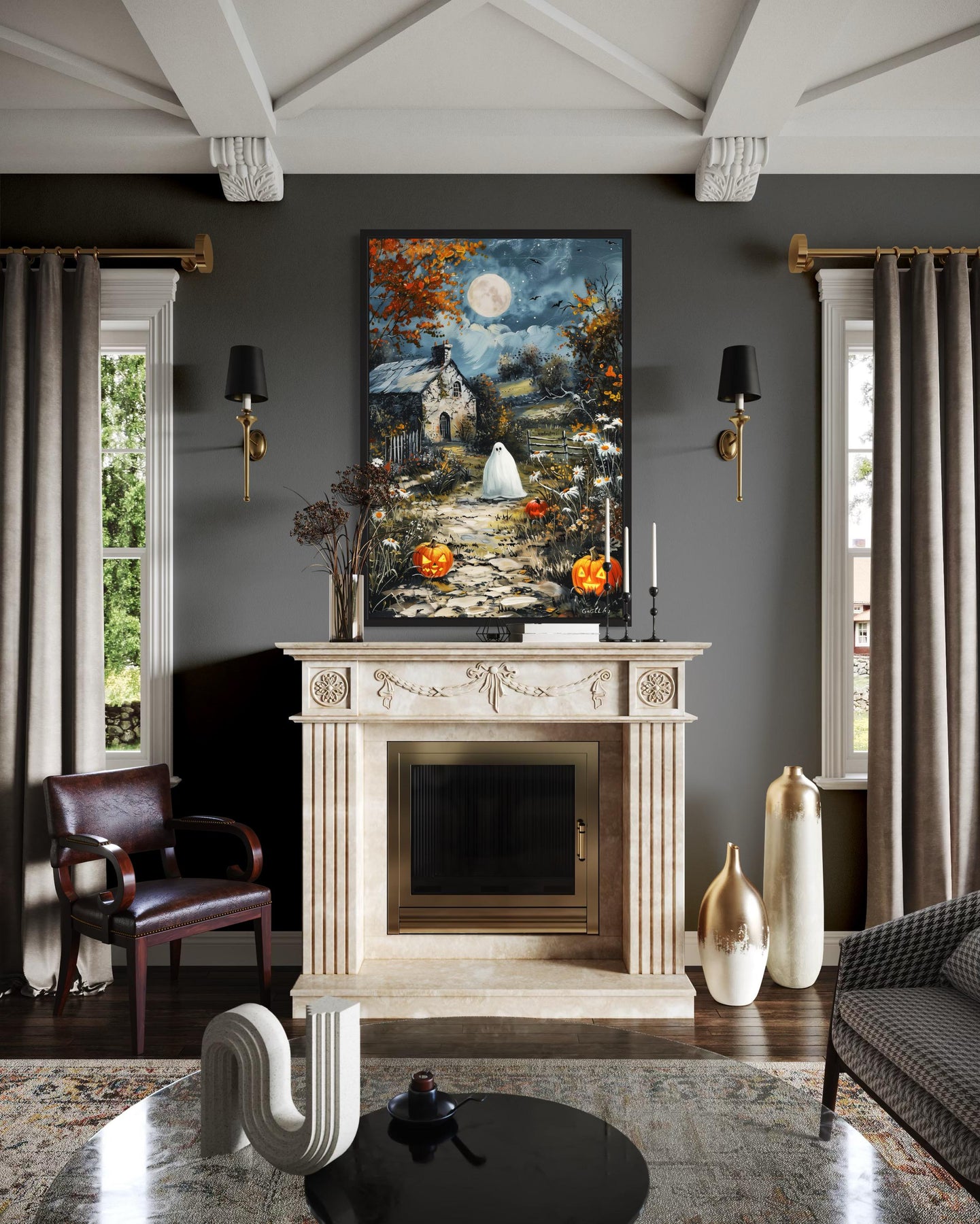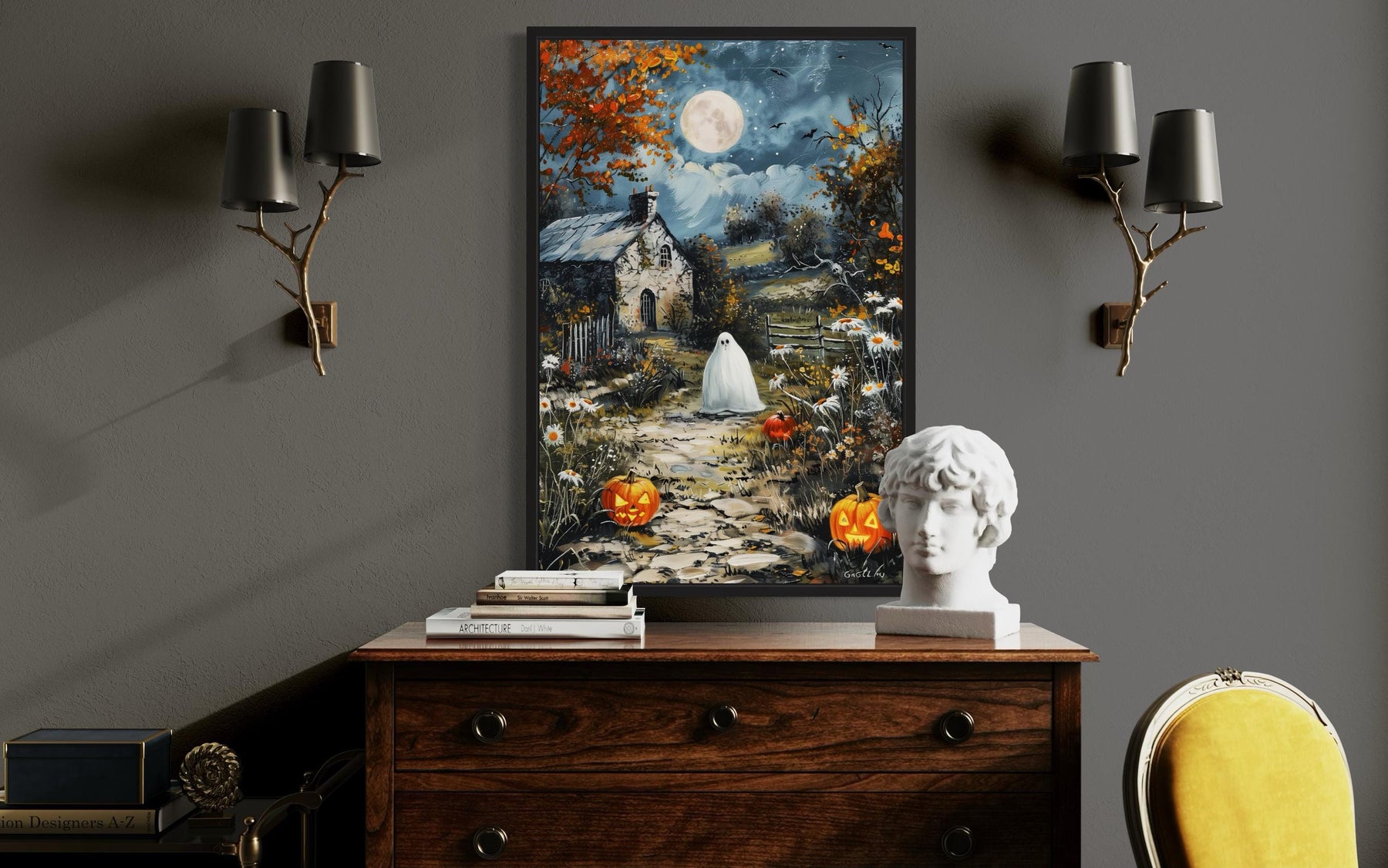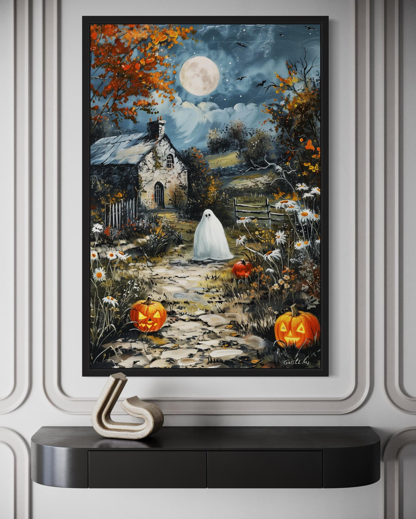 The color palette of this Halloween canvas print is carefully composed to capture the contrast between autumn warmth and supernatural coolness. The ghost glows in pale whites and smoky grays, standing out dramatically against the darker tones of the night. Pumpkins provide vibrant accents in deep orange, golden yellow, and muted amber, their warmth lighting the path with a festive yet eerie glow. The surrounding trees are painted in earthy browns and dark charcoals, anchoring the scene with rustic natural tones. Above, the sky is a canvas of deep navy and midnight blue, setting the stage for the luminous full moon to shine. The moon itself radiates ivory and silver, casting reflections across the leaves and mist, highlighting the textures of the ground and branches. Subtle highlights of bronze and sienna in the foliage add richness, evoking the essence of autumn while softening the gothic atmosphere. Mist and shadows in smoky gray tones stretch across the path, giving the piece atmospheric depth that feels both haunting and serene. This careful interplay of warm and cool tones ensures the piece works equally well in rustic or gothic-inspired spaces. The result is a palette that is instantly recognizable as seasonal while maintaining elegance, making this spooky ghost wall art an unforgettable addition to Halloween decor.