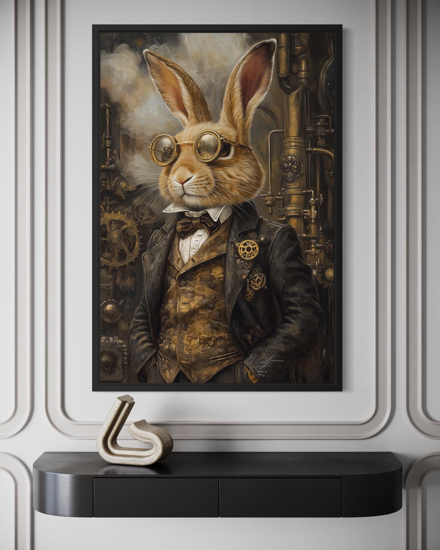 This steampunk bunny wall art merges the whimsical world of fantasy with the gritty sophistication of industrial design, creating a mesmerizing piece that instantly captures attention. The composition centers on a stately rabbit rendered with intricate metallic details, gears, and brass adornments that evoke the elegance of Victorian invention and the creativity of mechanical imagination. Every aspect of this framed canvas exudes personality and craftsmanship—from the subtle glint of copper highlights to the depth of shadow that emphasizes the character’s quiet intensity. The bunny’s expression carries both wit and mystery, as if it were an inventor or explorer in an alternate age of steam and clockwork marvels. The detailed textures of leather, brass, and aged steel create visual complexity while maintaining balance through refined artistry. Behind the figure, a muted industrial backdrop of cogwheels and riveted panels reinforces the theme of innovation, transporting the viewer to a world where science meets imagination. The result is an artwork that feels both fantastical and grounded, perfect for those who appreciate creativity laced with historical depth. This steampunk bunny canvas print stands as a conversation-starting focal point, blending playfulness and sophistication with effortless visual impact. It embodies the spirit of inventive artistry and is ideal for collectors who cherish unique and eccentric wall decor that tells a story of ingenuity and wonder.