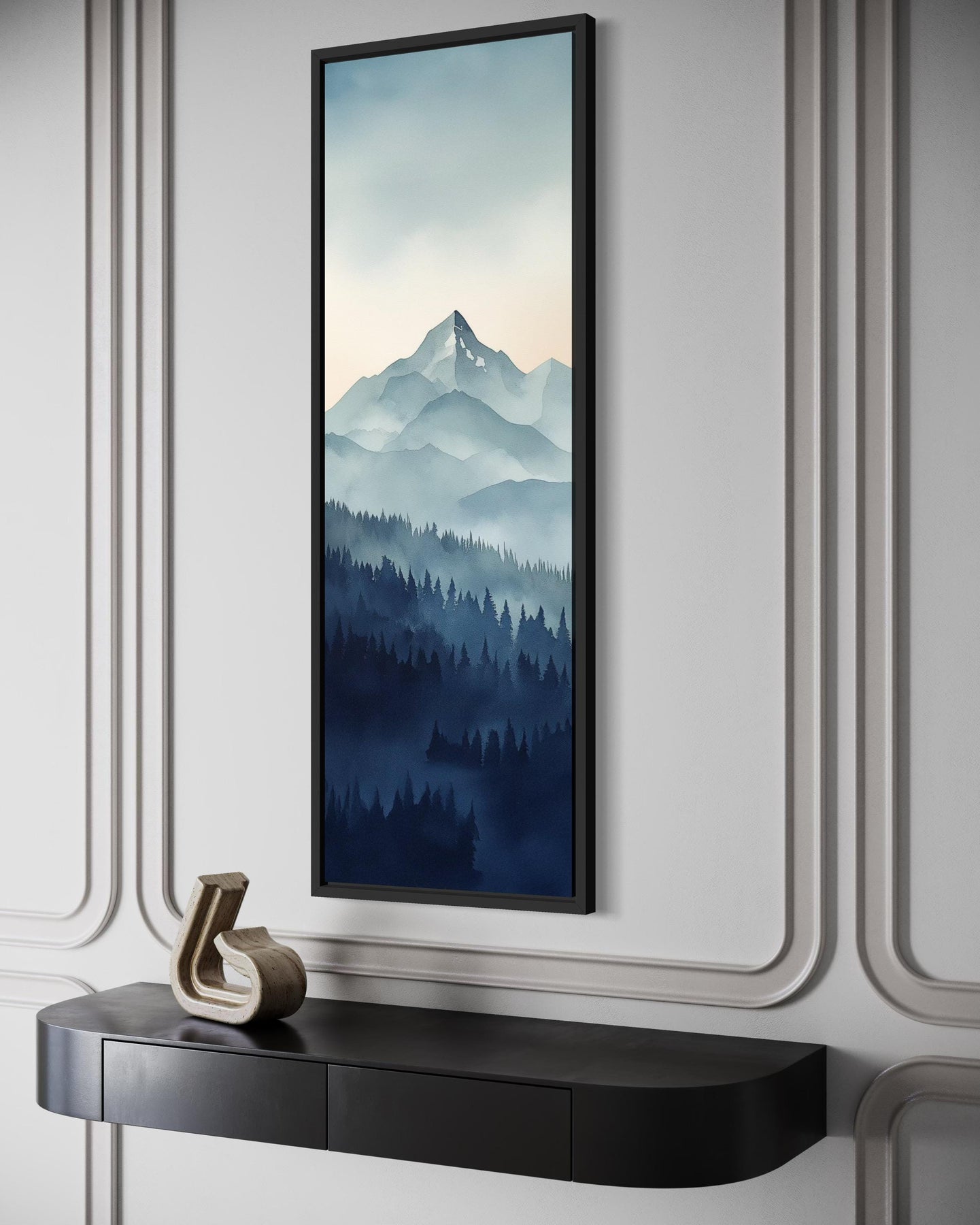 This Tall Narrow Navy Blue Mountain artwork fits seamlessly into modern, minimalist, and Scandinavian-inspired interiors that embrace stillness, balance, and light. Its vertical form makes it ideal for hallways, bedrooms, or living areas where height and proportion can be accentuated. The narrow design draws the eye upward, adding architectural rhythm and visual elegance to spaces that favor clean lines and subtle luxury. In contemporary homes, it pairs beautifully with neutral walls, pale woods, and soft lighting, bringing quiet drama without excess. For Scandinavian or Japandi-style interiors, its natural tones and serene imagery reinforce harmony, making it a perfect complement to organic materials and uncluttered design. In bedrooms, it inspires calm and reflection, evoking a feeling of morning peace as if looking out over a mountain range at first light. Its understated color palette harmonizes effortlessly with linens, natural fabrics, and textured accents, adding presence without distraction. Even in small spaces, the vertical scale creates openness, guiding the gaze and elongating the visual field. Whether displayed alone or as part of a gallery wall, it elevates interiors with quiet sophistication. This Tall Narrow Navy Blue Mountain Vertical canvas wall art captures the purity of landscape minimalism, bringing timeless serenity and strength into any modern home.