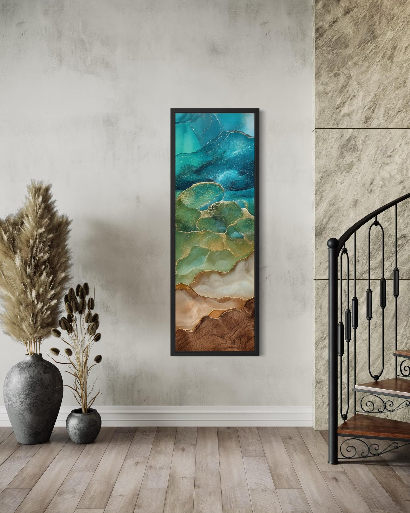 This teal and gold wall art captures modern elegance and visual balance through its tall narrow composition, uniting cool serenity with radiant warmth in an abstract interplay of color and texture. The painting’s vertical structure draws the eye upward, emphasizing flow and depth while bringing harmony to tall or compact spaces. Rich teal tones cascade through the canvas like tranquil water, while luminous gold veining introduces energy and sophistication, creating a visual dialogue between calm and brilliance. Each brushstroke carries an organic rhythm, blending movement and stillness in perfect equilibrium. The soft transitions between teal, turquoise, and gold evoke the sensation of sunlight filtering through water or light dancing on metal, creating a multidimensional effect that changes subtly under different lighting conditions. The piece is both soothing and powerful, balancing natural fluidity with a refined modern aesthetic. The tall narrow format gives the composition a striking architectural quality, ideal for filling vertical spaces or pairing with minimalist interiors. This abstract canvas print embodies the essence of contemporary style—bold yet serene, expressive yet controlled. The result is a piece that feels alive, atmospheric, and timeless, capable of transforming any wall into a statement of artistic refinement and calm energy.