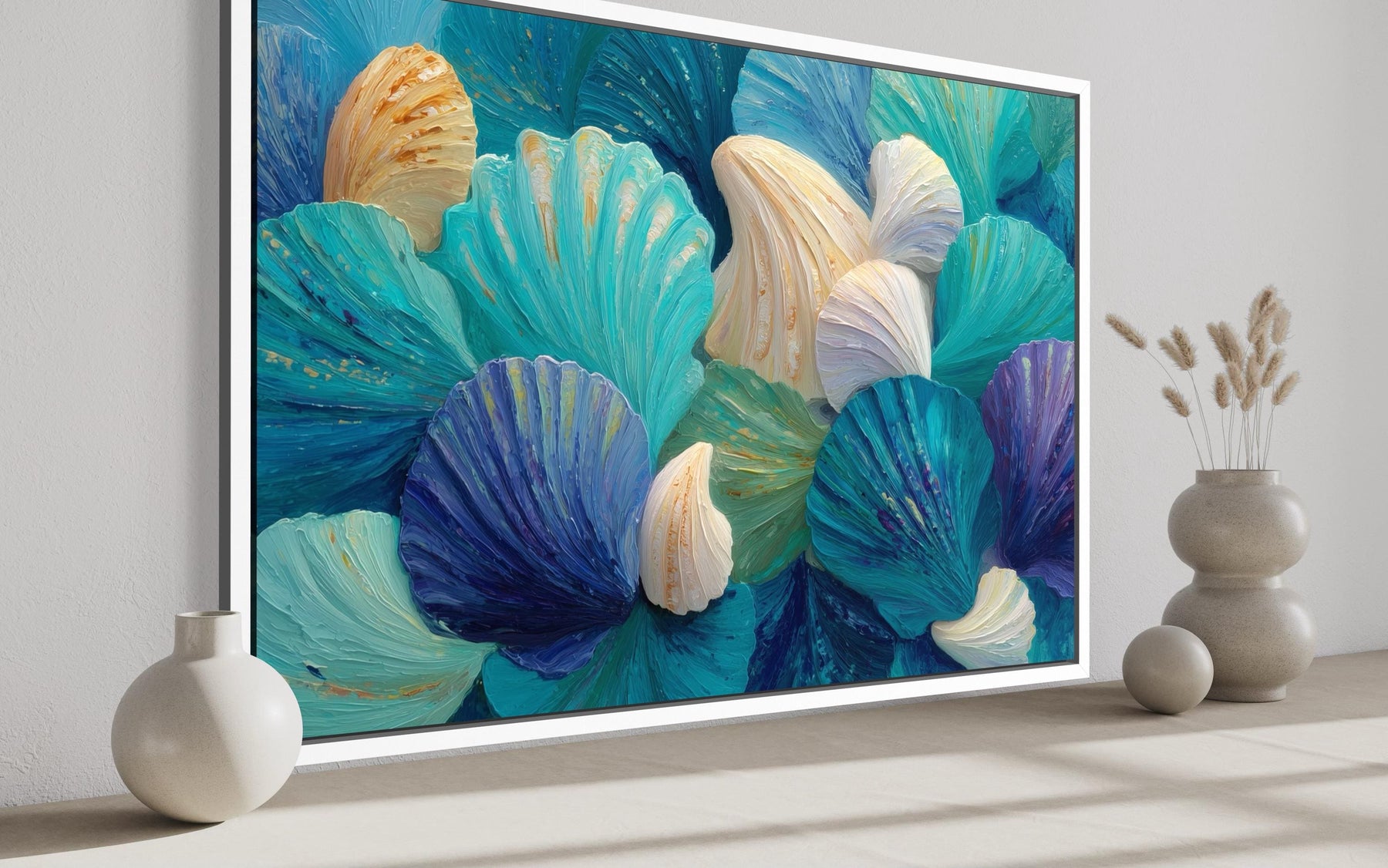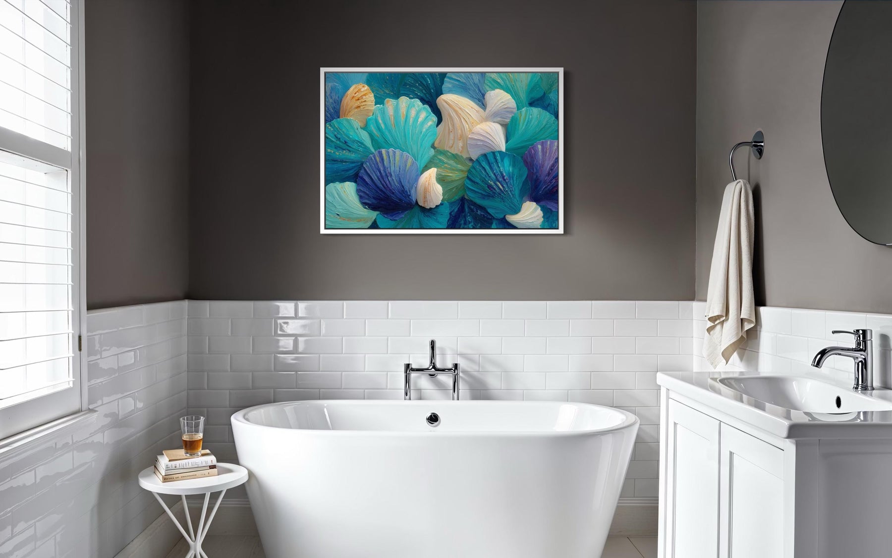 Our Teal Blue Aqua Shell wall art captures the essence of coastal tranquility and brings it straight into your bathroom through a symphony of flowing colors and delicate abstract forms. The artwork features overlapping seashell shapes, each one softly textured and shaded to mimic the smooth contours found in nature, making it perfect for enhancing the atmosphere of a modern coastal bathroom. The design blends abstract artistry with natural realism, transforming the wall into a soothing focal point that evokes both the sea and the serenity of daily rituals. Gentle brushstrokes ripple through the composition, imitating underwater motion, while the luminous teal and aqua tones reflect the purity and calm of ocean waves. The layered effect of the shells creates visual depth, giving the illusion of movement and fluidity that feels alive yet peaceful. This Teal Blue Aqua Shell painting elevates a bathroom or spa space by turning it into a sanctuary of color and light. Its soft curves and organic composition bring harmony to tiled walls and mirror reflections, adding texture and emotion where minimal décor often prevails. The canvas print maintains an elegant balance between coastal vibrancy and minimalist calm, complementing spaces that embrace natural light and subtle elegance. Its gentle visual rhythm enhances the mood of morning routines and evening relaxation alike, inviting a moment of reflection every time you enter. Calming yet vivid, our Teal Blue Aqua Shell canvas wall art creates a luminous retreat within your home, transforming an ordinary bathroom into a serene coastal haven inspired by ocean beauty and Teal Blue Aqua Shell wall art.