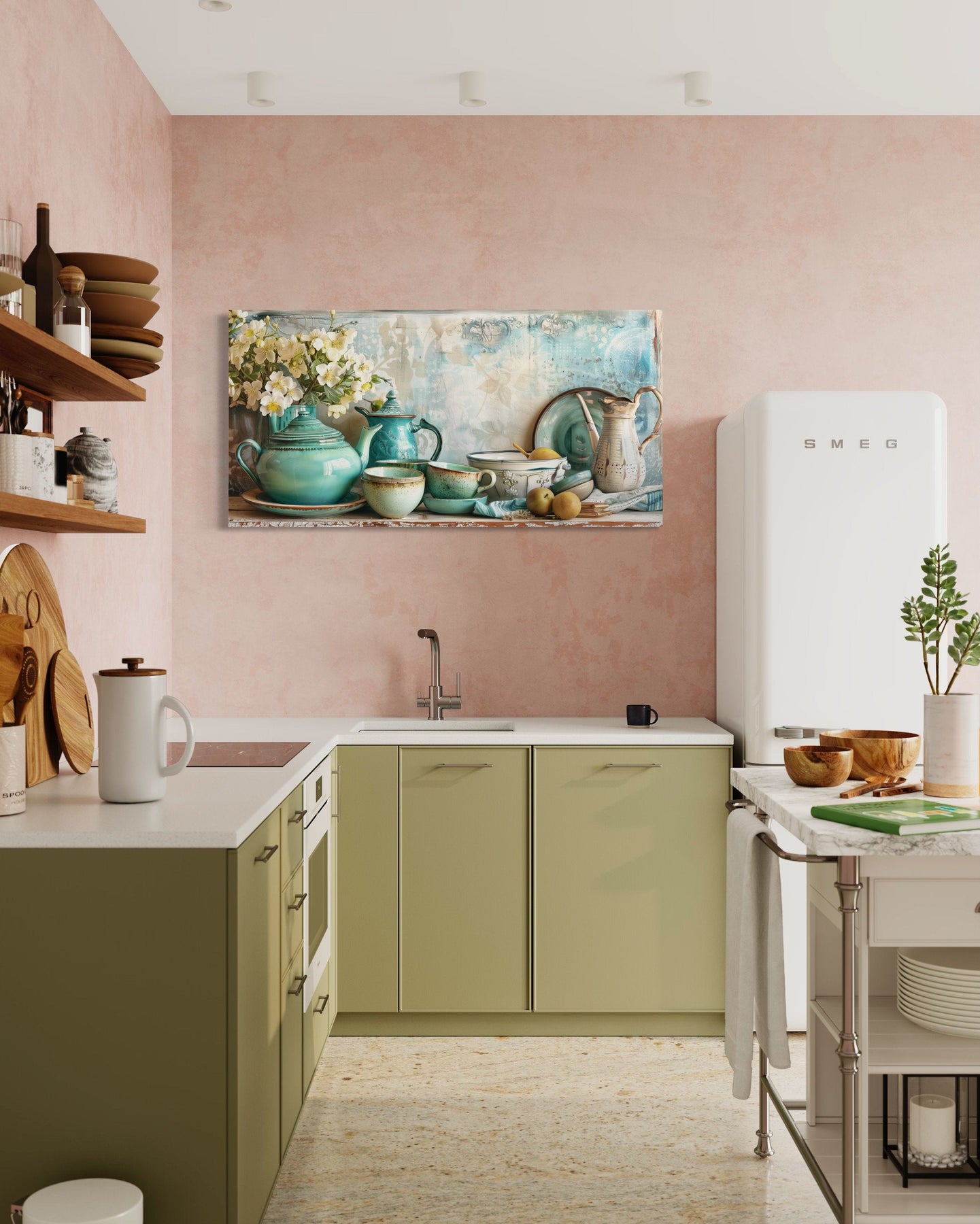 The color palette of this teal kitchenware farmhouse wall art is a sophisticated mix of cool teals and earthy neutrals. The vintage teal tones of the kitchenware stand out beautifully against the warm beige and wood-like brown hues of the rustic backdrop. Delicate highlights of white and cream provide balance and softness, creating an overall soothing effect. These expertly chosen colors evoke feelings of comfort and nostalgia, reminiscent of simpler times in a farmhouse kitchen. The subtle variations in tone and texture add depth and realism, bringing the scene to life. This cohesive color scheme ensures the artwork integrates seamlessly with natural wood furnishings, light countertops, and soft pastel accents. Let the serene hues of this teal kitchenware wall art infuse your kitchen with warmth and charm.