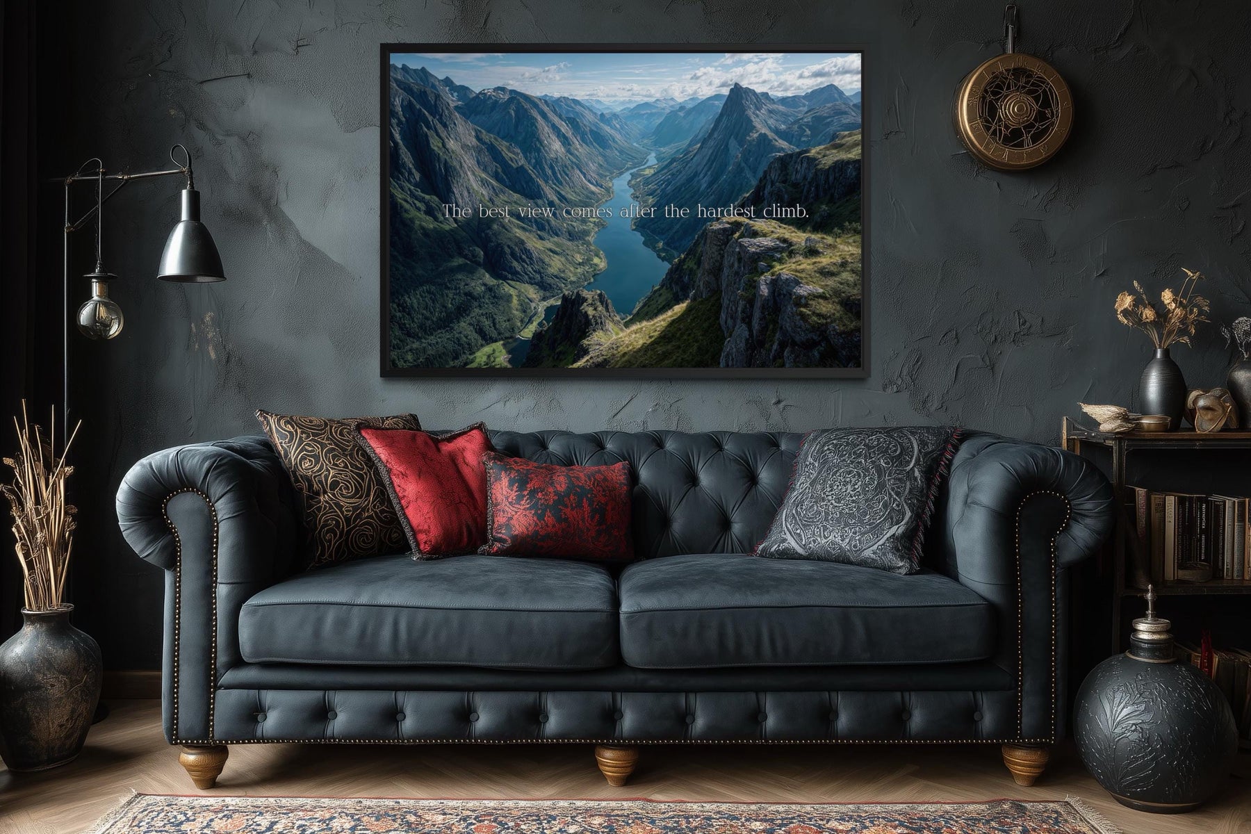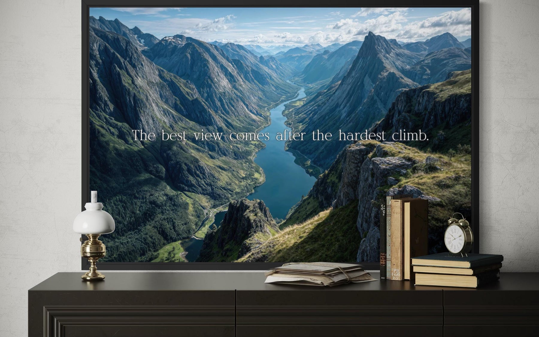 This motivational quote canvas captures the essence of perseverance, triumph, and growth through both its message and breathtaking design. The quote, “The best view comes after the hardest climb,” is elegantly placed over a sweeping mountain landscape that celebrates endurance and reward. The panoramic vista reveals towering cliffs, lush valleys, and soft sunlight cascading over distant peaks, symbolizing the reward that follows challenge and persistence. The blend of natural grandeur and timeless wisdom transforms this piece into a daily reminder of strength and purpose. Ideal for home offices, modern workspaces, or living areas, this artwork serves as both motivation and visual serenity. The composition evokes forward movement and inner balance — a representation of life’s climb and the breathtaking clarity that follows success. Every detail, from the sharp ridge lines to the tranquil skies, creates a sense of depth and optimism that keeps the viewer inspired to move upward, no matter the obstacles. Printed on high-quality canvas with meticulous attention to tone and texture, this piece brings calm focus and motivation to any space, reminding us that effort and patience illuminate life’s most meaningful views.