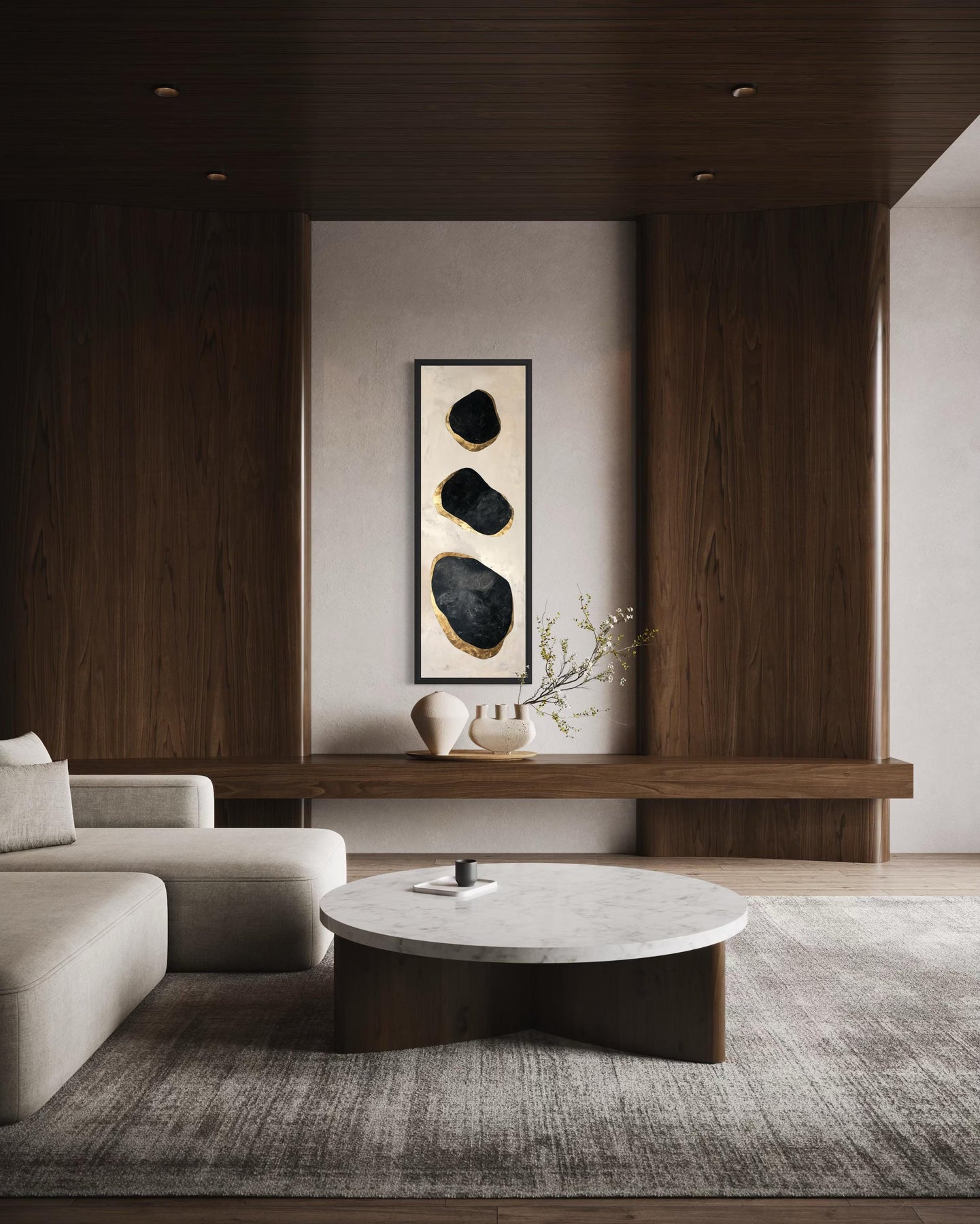 The color palette of this tall narrow abstract wall art is restrained, modern, and rich in contrast. The four central shapes stand out immediately—two deep matte black forms anchor the top and bottom, while a gold-outlined and gold-filled rock add contrast and warmth in the center. The gold is not overly shiny but appears brushed, with soft reflections that add depth without glare. The background holds everything together through layers of creamy off-white, light beige, and soft stone tones that keep the composition from feeling flat. The faint white line connecting the shapes is barely raised but still visible, bringing visual cohesion without overpowering the piece. Subtle grain textures and printed shadows along the rocks create the illusion of dimensionality. The overall effect is monochromatic with purposeful highlights, combining neutral tones with metallic accents to allow the rocks to float freely yet feel grounded. Though minimal in palette, the artwork feels complete and satisfying, designed to enhance modern interiors without adding visual noise. The canvas finish allows every element to feel deliberate, not glossy or artificial. This black and gold abstract rock wall decor uses its refined palette to express sophistication through restraint.