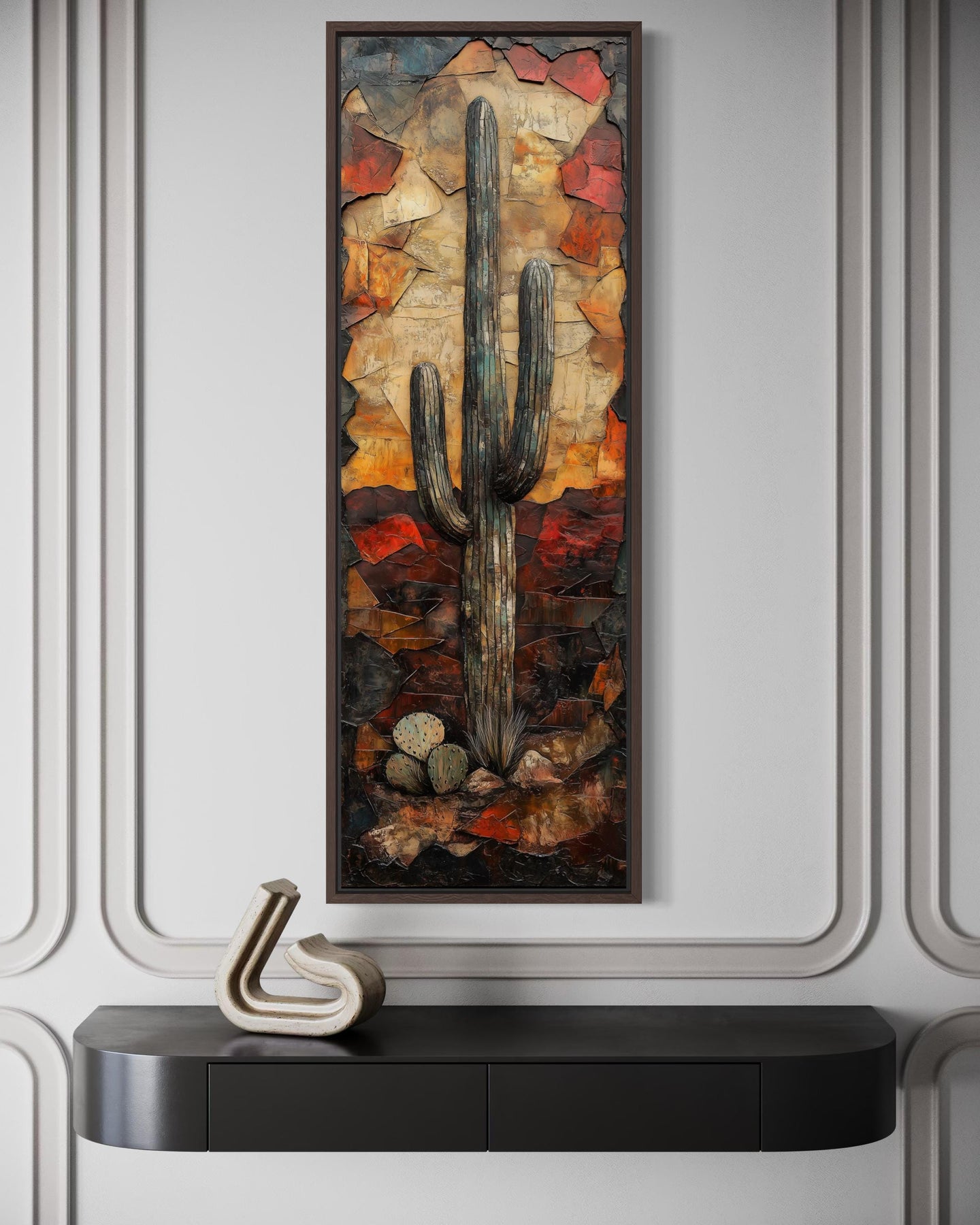 This Saguaro Cactus wall decor is especially suited for Southwestern interiors where desert landscapes and warm natural colors define the personality of the space. In a Southwestern living room with warm earth toned walls, rustic wood furniture, and woven textiles, the artwork becomes a striking focal point that reflects the surrounding desert aesthetic. The cactus imagery resonates strongly with people who appreciate desert environments, open landscapes, and Southwestern design traditions. Placed between windows, beside a fireplace, or along a narrow wall space, the tall vertical canvas print introduces height and visual structure to the room. The cactus subject pairs naturally with interiors that feature clay pottery, desert plants, leather furniture, and warm natural materials. Because the artwork uses strong vertical composition, it works especially well in spaces that need tall narrow wall decor rather than wide horizontal pieces. The desert landscape imagery reinforces the calm atmosphere commonly associated with Southwestern homes. Warm sunset tones complement interiors that rely on terracotta colors, natural wood finishes, and earthy neutral palettes. The cactus scene adds character while maintaining the relaxed simplicity typical of desert inspired design. For Southwestern homes and desert themed interiors, this Saguaro Cactus canvas wall art becomes a striking centerpiece of desert wall decor.
