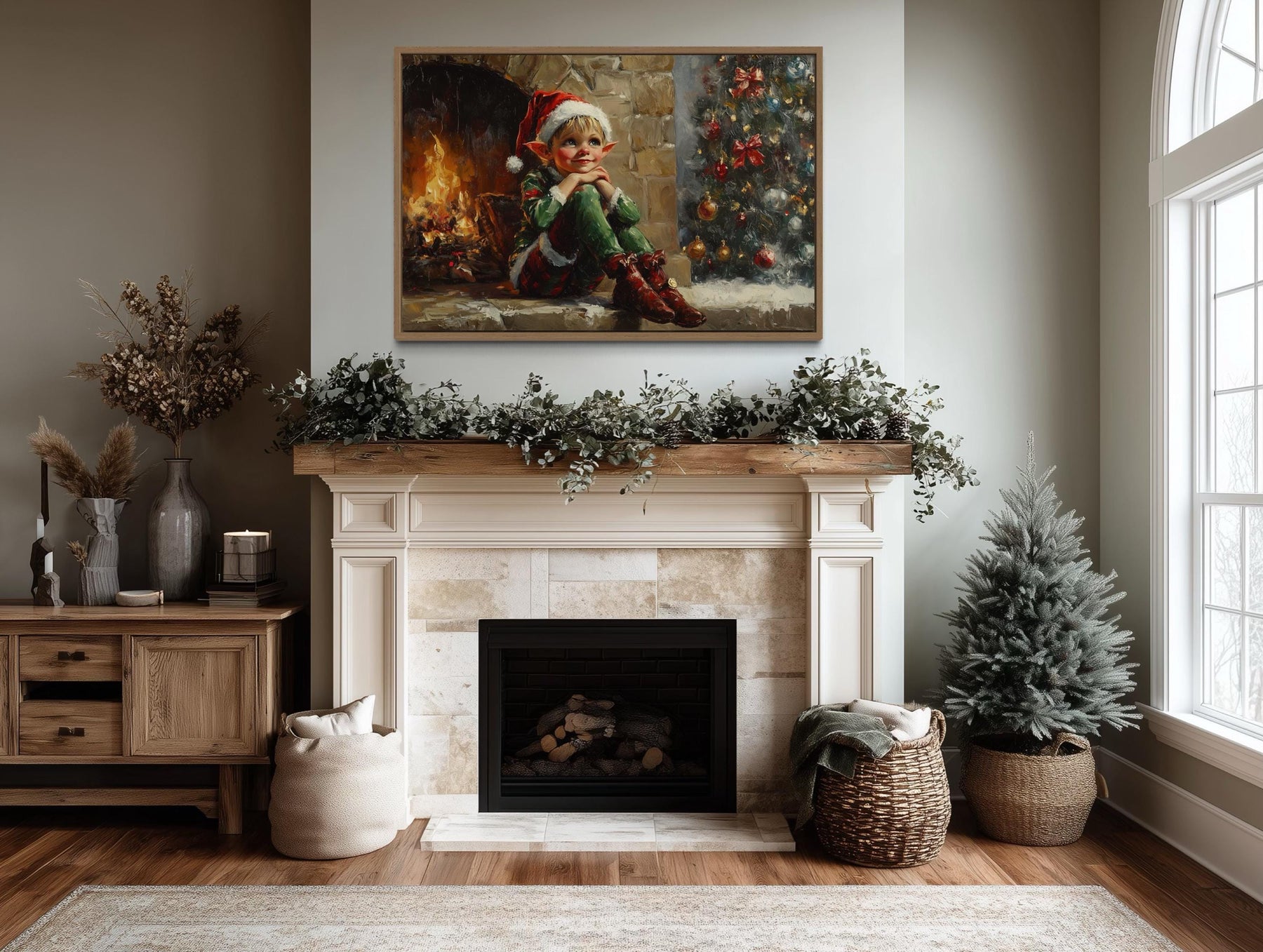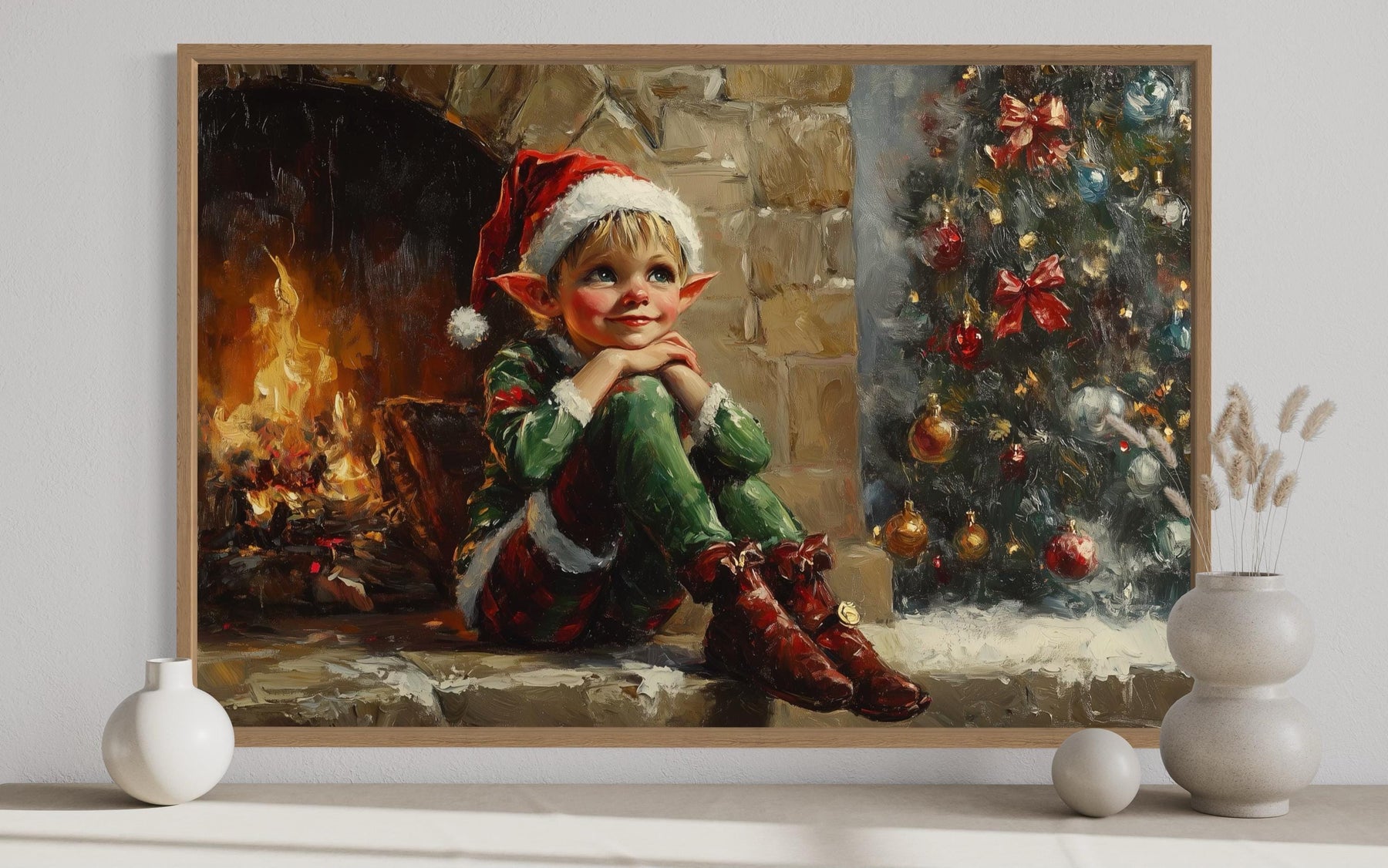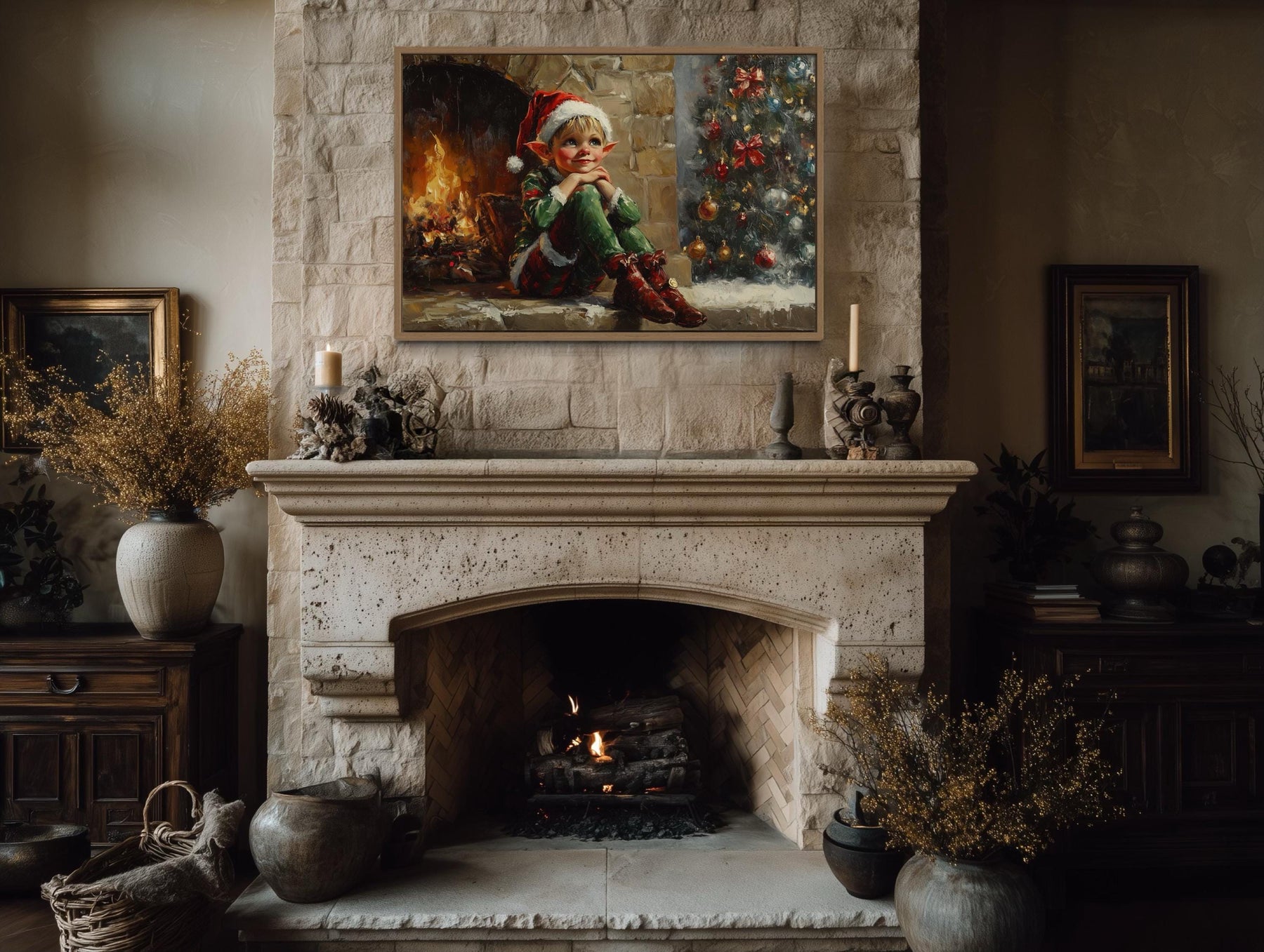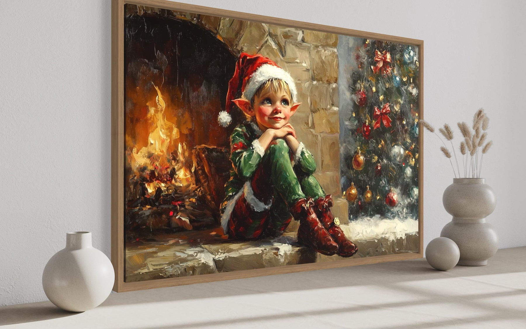 This Vintage Christmas Elf by Fireplace canvas print is perfect for farmhouse interiors and traditional holiday settings where warmth and storytelling matter most. In a farmhouse living room, it pairs effortlessly with natural wood beams, stone fireplaces, and cozy plaid throws, becoming the centerpiece of a family gathering space. Hung above a mantel, it complements evergreen garlands, vintage lanterns, and heirloom stockings, creating an inviting scene that feels both classic and alive. For homes decorated in a traditional holiday style, it echoes cherished customs of fireside gatherings, seasonal baking, and festive music, making it a natural fit for the heart of family celebrations. The whimsical elf character adds a touch of playful charm to spaces where children and adults share in the magic of Christmas Eve. Its vintage aesthetic appeals to collectors of antique holiday art and those who love the timeless look of old-fashioned Christmas cards. Even in a neutral modern farmhouse palette, it softens clean lines with its intricate seasonal details and warm glow. Whether placed in a welcoming entryway or as the focal point of a cozy den, it enriches the atmosphere with festive nostalgia and joyful character. With every detail designed to celebrate heritage and happiness, the Vintage Christmas Elf by Fireplace wall art completes your holiday home with charm and lasting delight.