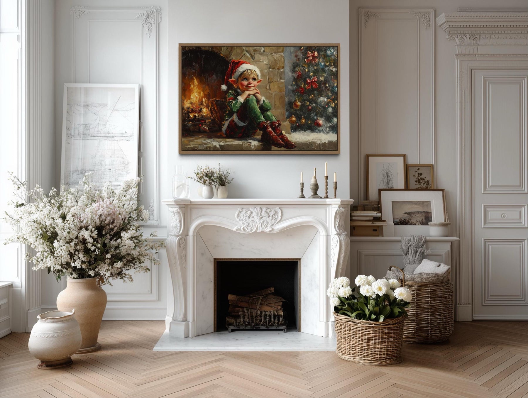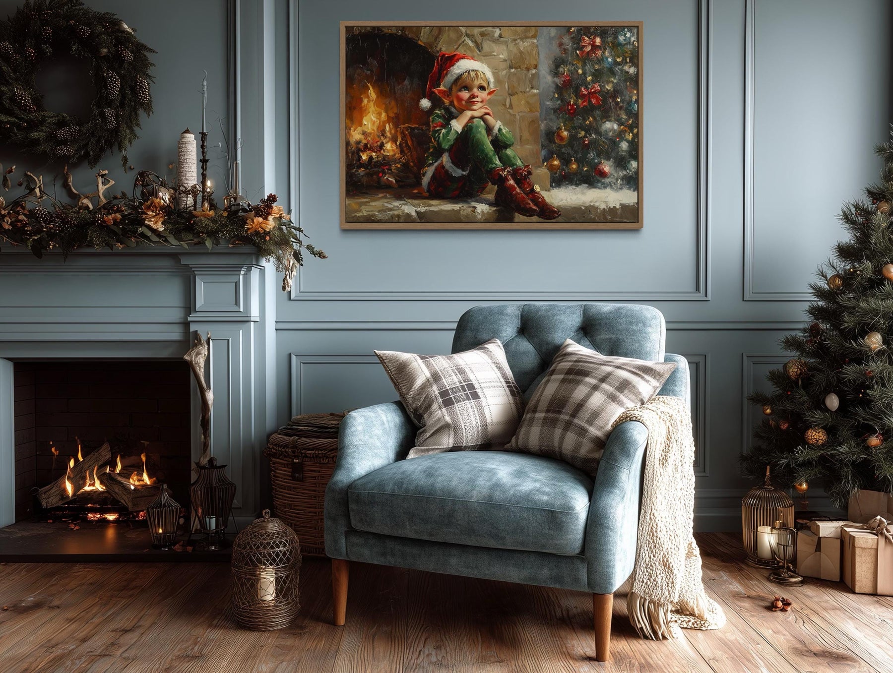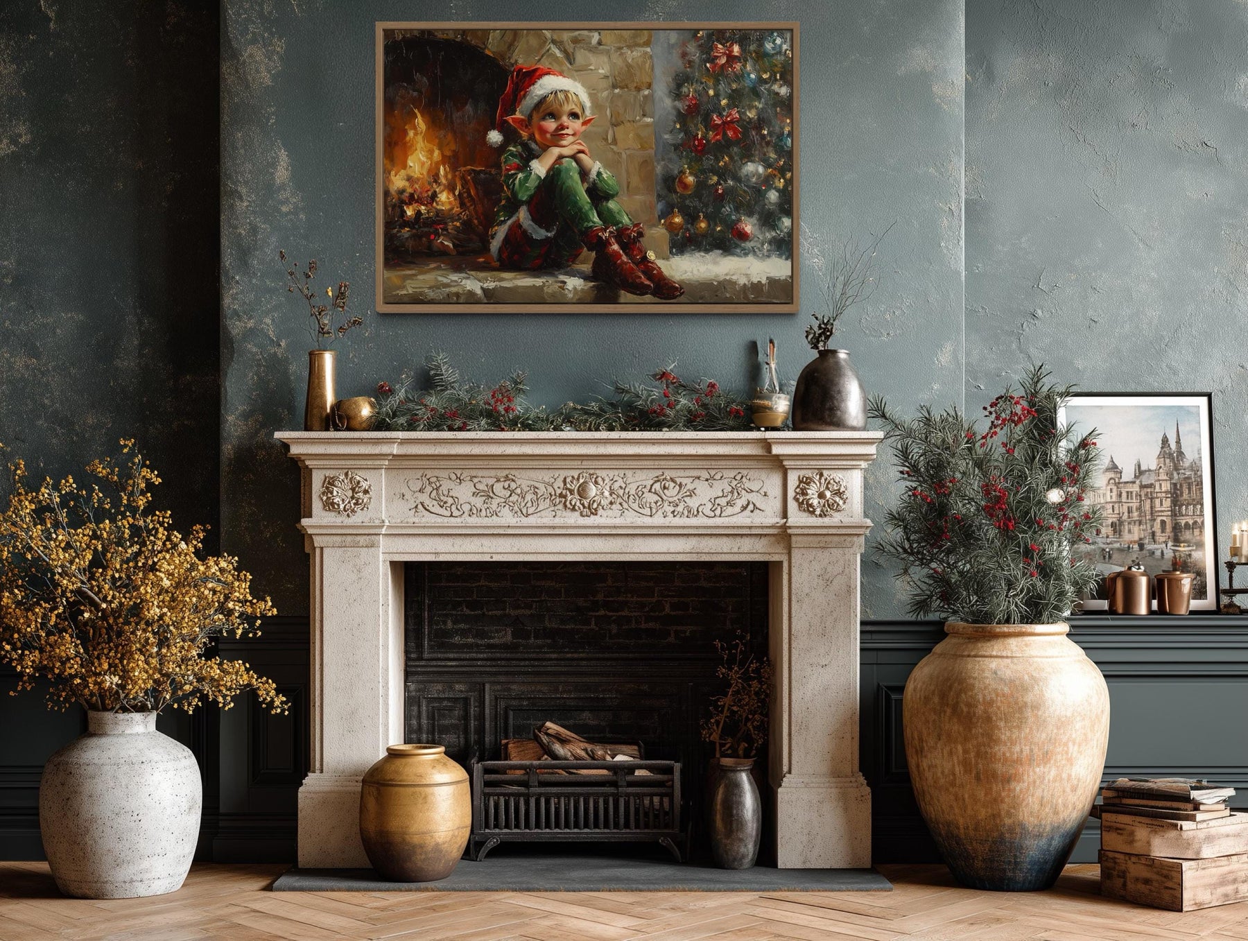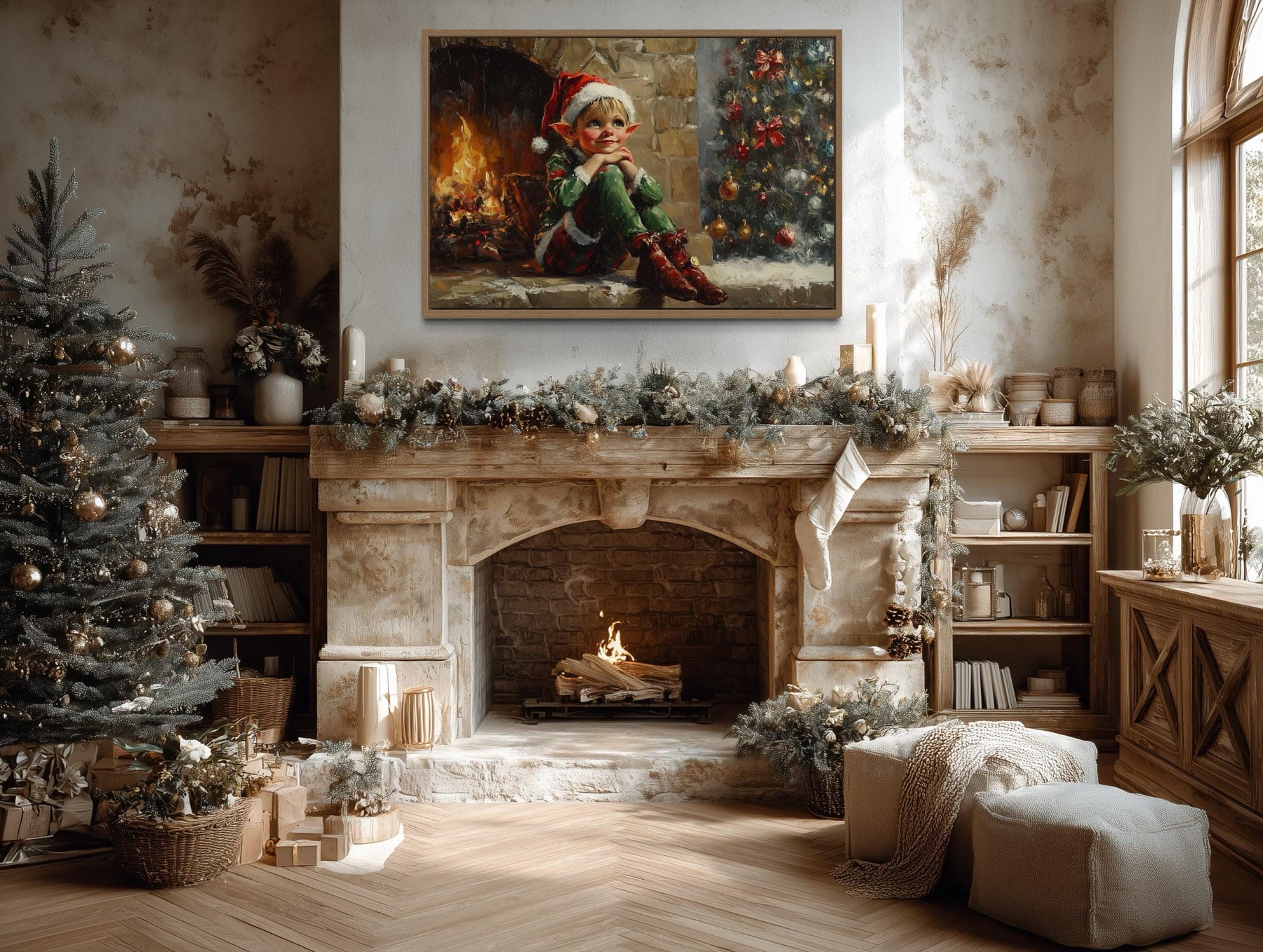 This Vintage Christmas Elf by Fireplace canvas print is perfect for farmhouse interiors and traditional holiday settings where warmth and storytelling matter most. In a farmhouse living room, it pairs effortlessly with natural wood beams, stone fireplaces, and cozy plaid throws, becoming the centerpiece of a family gathering space. Hung above a mantel, it complements evergreen garlands, vintage lanterns, and heirloom stockings, creating an inviting scene that feels both classic and alive. For homes decorated in a traditional holiday style, it echoes cherished customs of fireside gatherings, seasonal baking, and festive music, making it a natural fit for the heart of family celebrations. The whimsical elf character adds a touch of playful charm to spaces where children and adults share in the magic of Christmas Eve. Its vintage aesthetic appeals to collectors of antique holiday art and those who love the timeless look of old-fashioned Christmas cards. Even in a neutral modern farmhouse palette, it softens clean lines with its intricate seasonal details and warm glow. Whether placed in a welcoming entryway or as the focal point of a cozy den, it enriches the atmosphere with festive nostalgia and joyful character. With every detail designed to celebrate heritage and happiness, the Vintage Christmas Elf by Fireplace wall art completes your holiday home with charm and lasting delight.