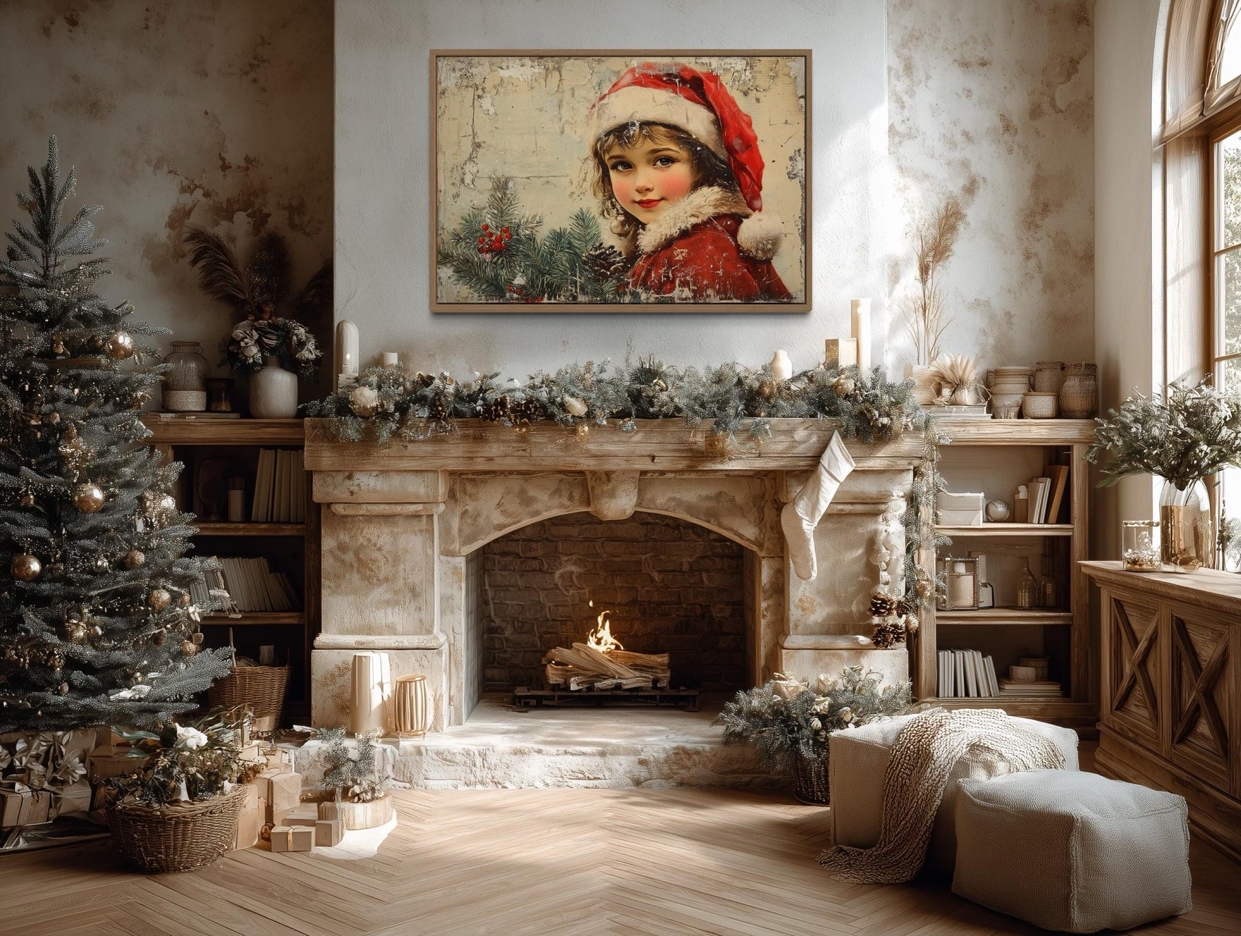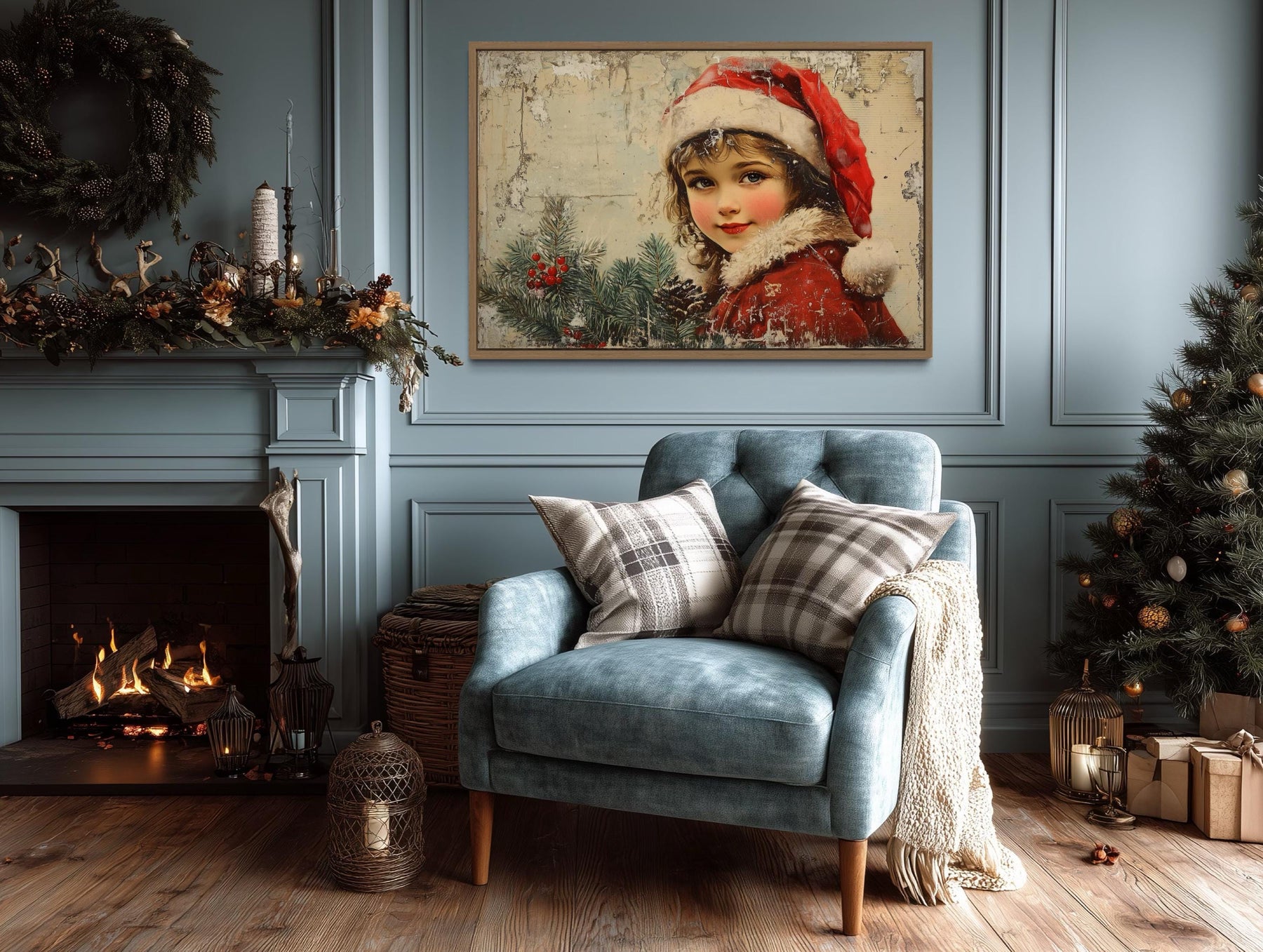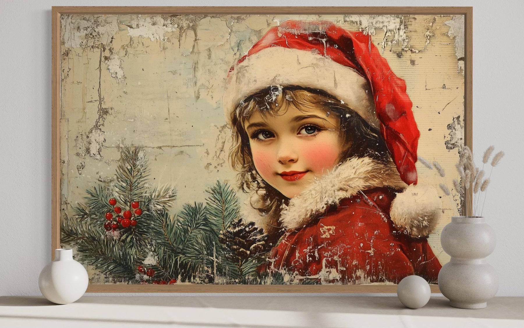 This Vintage Christmas Girl in Red Santa Hat canvas print is ideal for farmhouse interiors and homes decorated with traditional holiday charm. In a farmhouse living room, it pairs beautifully with natural wood beams, rustic fireplaces, and soft plaid blankets, setting a cozy scene for winter gatherings. Hung above a mantel, it complements evergreen garlands, twinkling lights, and heirloom stockings, welcoming guests with cheerful warmth. For homes that treasure classic Christmas traditions, it matches antique ornaments, vintage sleigh bells, and hand-crafted wreaths, creating a festive focal point that never goes out of style. The vintage postcard feel of this artwork appeals to collectors and those who appreciate the elegance of old-world holiday décor. Even in modern farmhouse settings, its gentle colors and nostalgic subject soften clean lines and add heartfelt seasonal beauty. Whether showcased in an inviting entryway or highlighted in a dining room where holiday meals are shared, it brings a timeless message of joy. Every glance at the radiant smile and bright red hat evokes fond memories of childhood Christmases and family celebrations. The Vintage Christmas Girl in Red Santa Hat wall art completes any holiday home with lasting charm, tradition, and classic festive spirit.