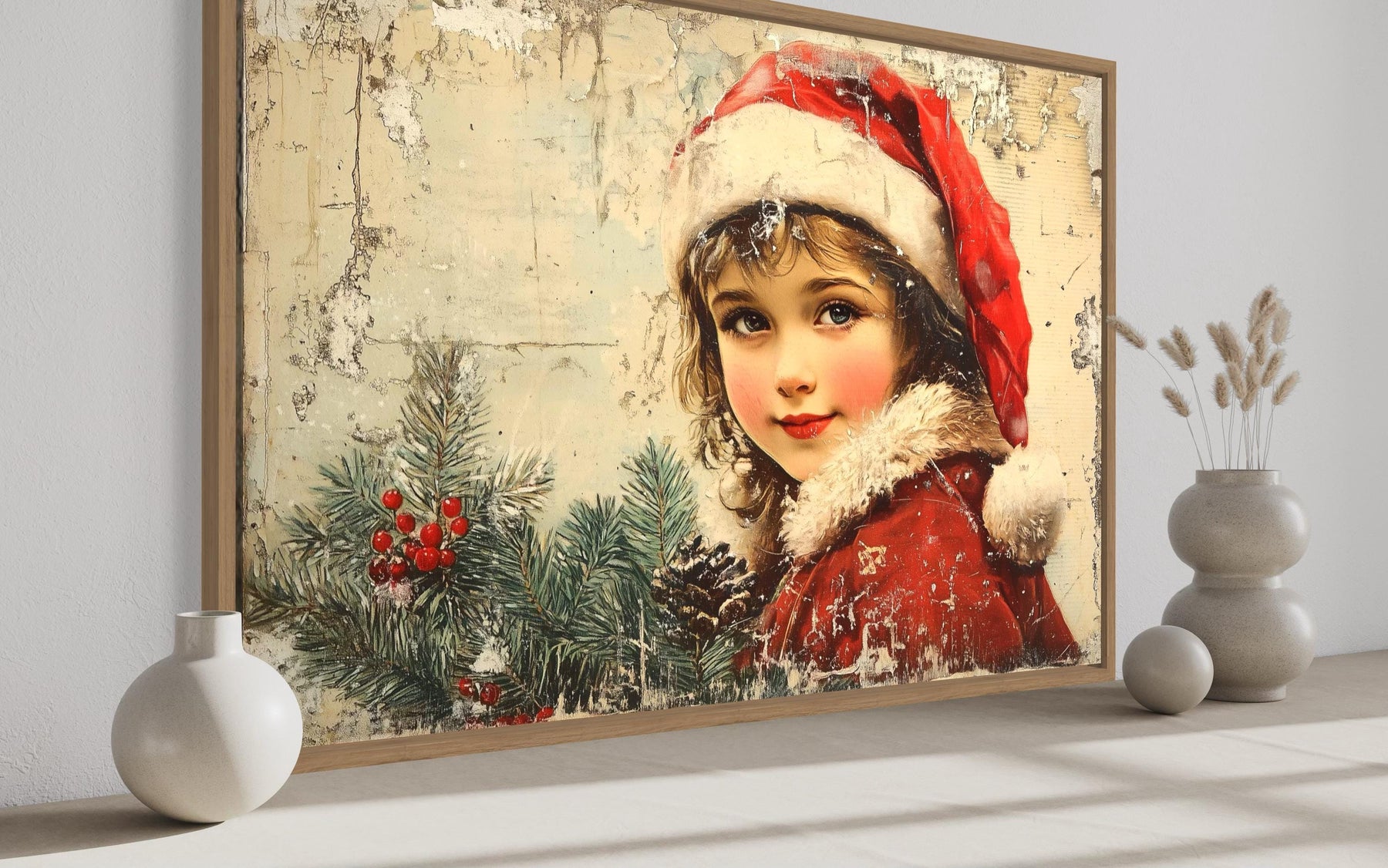Our Vintage Christmas Girl in Red Santa Hat canvas wall art captures the sweetness and charm of an old-fashioned holiday portrait with timeless appeal. This Vintage Christmas Girl painting shows a smiling young girl wearing a plush red Santa hat trimmed with soft white fur, her rosy cheeks glowing as if touched by a gentle winter breeze. The background features subtle greenery and delicate holly accents, adding festive depth while keeping the focus on her joyful expression. Gentle brushwork and softly aged textures give the image the feel of a treasured antique postcard, while the high-quality canvas print ensures modern clarity and lasting color. Each detail, from the shimmer of the hat’s trim to the delicate highlights in her hair, is rendered with care to celebrate classic Christmas elegance. Warm sepia undertones and light cream accents create a nostalgic atmosphere that recalls handwritten holiday greetings and cozy winter evenings. This Vintage Christmas Girl in Red Santa Hat canvas print combines traditional artistry with durable materials, offering an heirloom look that will brighten celebrations for years to come. Perfect for collectors of vintage holiday art or anyone who loves the gentle joy of classic Christmas imagery, this piece captures the magic of the season. The Vintage Christmas Girl in Red Santa Hat wall art delivers pure festive beauty with every glance.