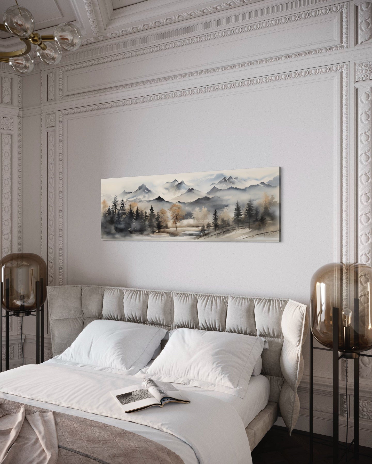 This Watercolor Mountain Landscape wall art is a versatile piece that can enhance various home styles, particularly in spaces where tranquility and relaxation are key. Its earthy tones and serene imagery make it an excellent choice for rustic or farmhouse decor, where it can add a touch of natural beauty. In a modern or contemporary setting, the soft watercolor technique and horizontal layout offer a calming contrast to sleek lines and minimalist design. It’s also perfect for traditional interiors, providing a timeless element that bridges classic and contemporary aesthetics. Placed above the bed, this wall art becomes a centerpiece that sets the tone for the entire room, promoting a peaceful and restful environment. Whether your style is rustic, modern, or somewhere in between, this Watercolor Mountain Landscape artwork brings the beauty and tranquility of nature indoors.