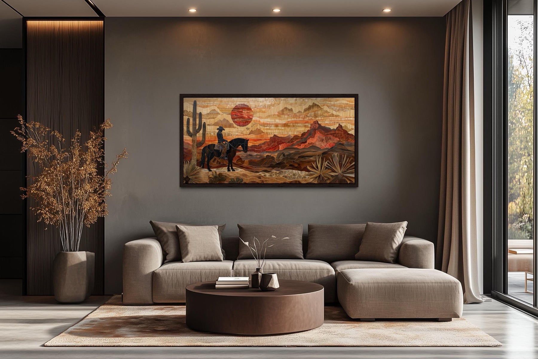 This Western Cowboy canvas print is an ideal centerpiece for rustic living rooms and Southwestern-style dens where authentic Western spirit is celebrated. In a cozy living room with leather furniture, exposed wood beams, and warm desert colors, it reinforces the feeling of frontier hospitality and open skies. Southwestern dens or reading rooms benefit from its vivid storytelling and earthy texture, perfectly complementing Navajo-inspired textiles and natural wood furnishings. The wide panoramic format makes it easy to create a dramatic focal point above a stone fireplace or along a long hallway wall. Lovers of ranch-style design will find its rugged charm a seamless fit with reclaimed wood tables and vintage metal accents. Even modern spaces gain a dramatic layer of warmth, as the sunset’s glowing palette softens clean architectural lines while still commanding attention. The layered wood style gives the look of authentic aged boards while keeping installation simple and maintenance minimal. Its durability and rich detail make it ideal for year-round enjoyment, bringing a piece of the untamed desert indoors. Whether you’re outfitting a country retreat or adding personality to a city loft, this artwork tells a story of freedom and wide horizons. With enduring character and sweeping color, our Western Cowboy canvas wall art finishes any Southwestern or rustic space with unmatched Western style.