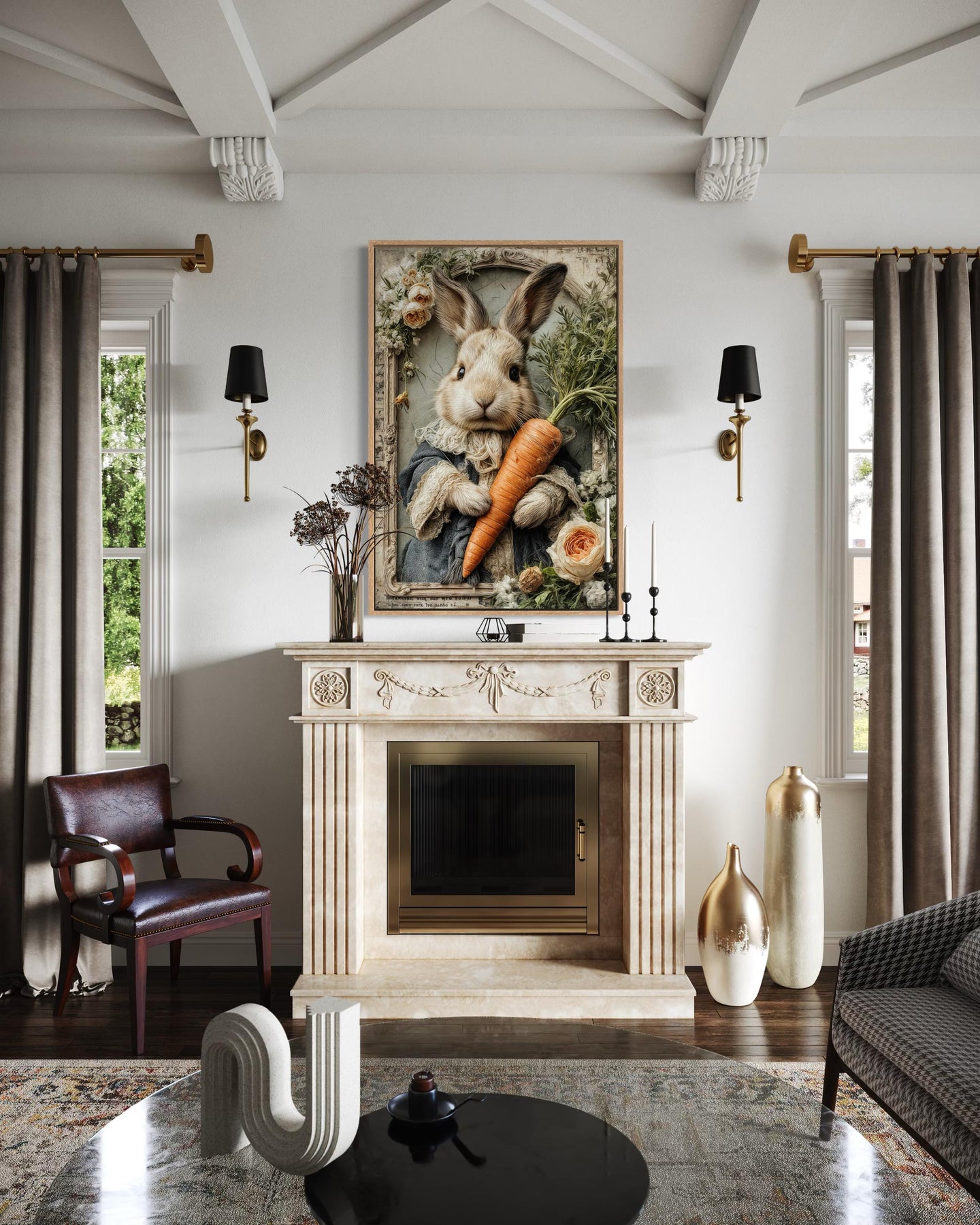 Whimsical canvas wall art of a bunny holding a carrot, framed above a classic fireplace mantel.