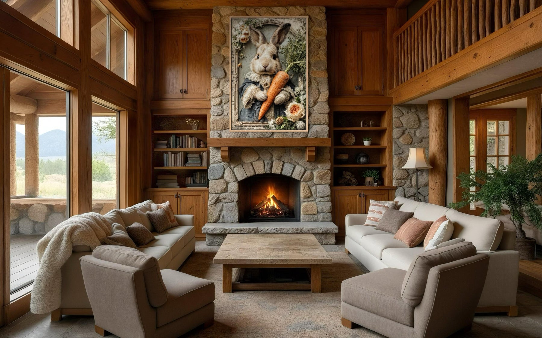Whimsical canvas wall art of a bunny with a carrot and flowers above a stone fireplace.