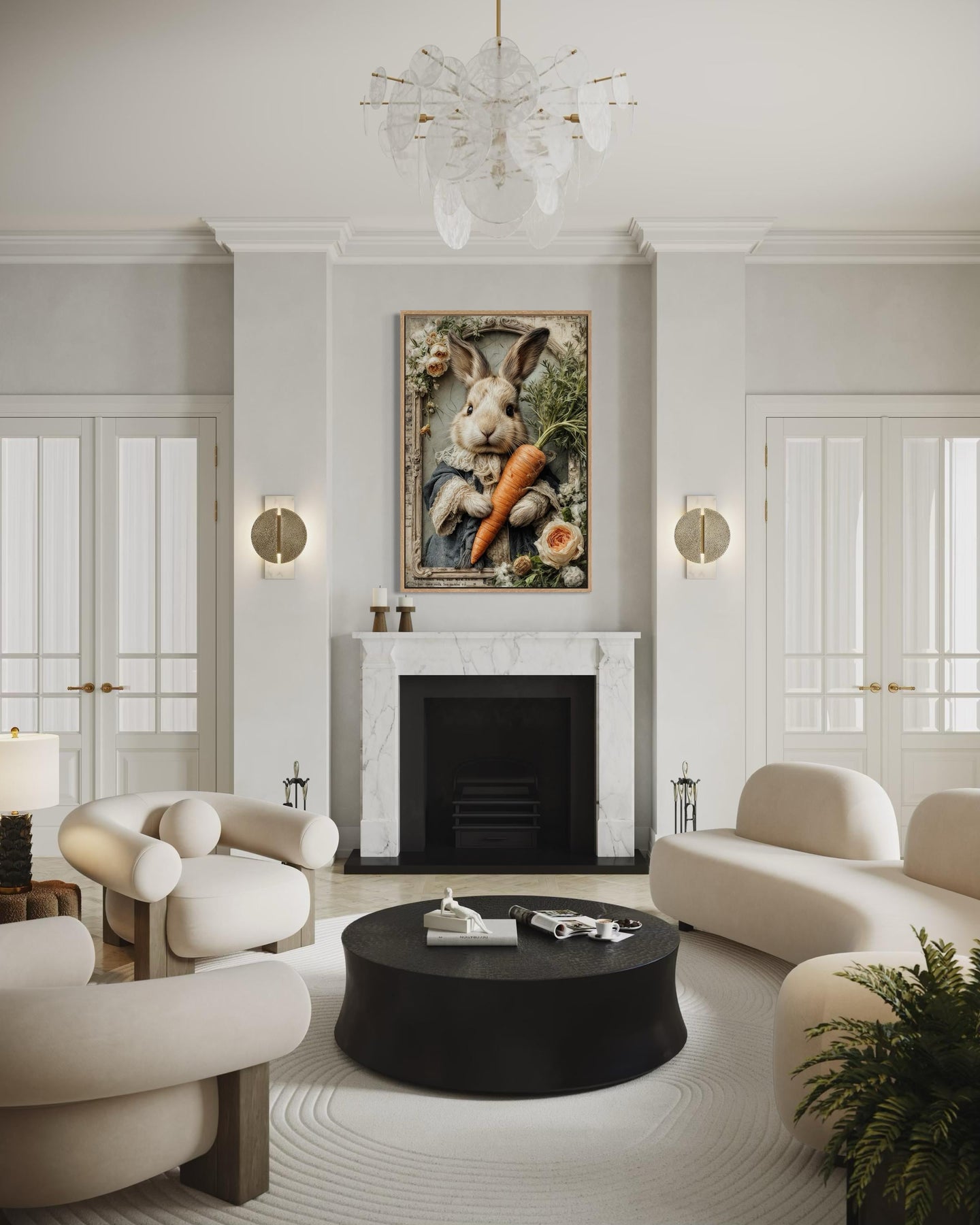 Whimsical canvas wall art of a bunny with a carrot in a floral frame above a marble fireplace.