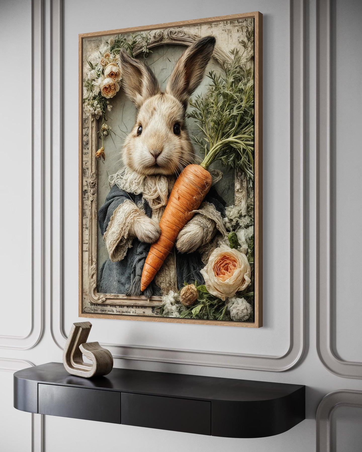 Whimsical canvas wall art of a bunny in a coat holding a carrot, framed by flowers.