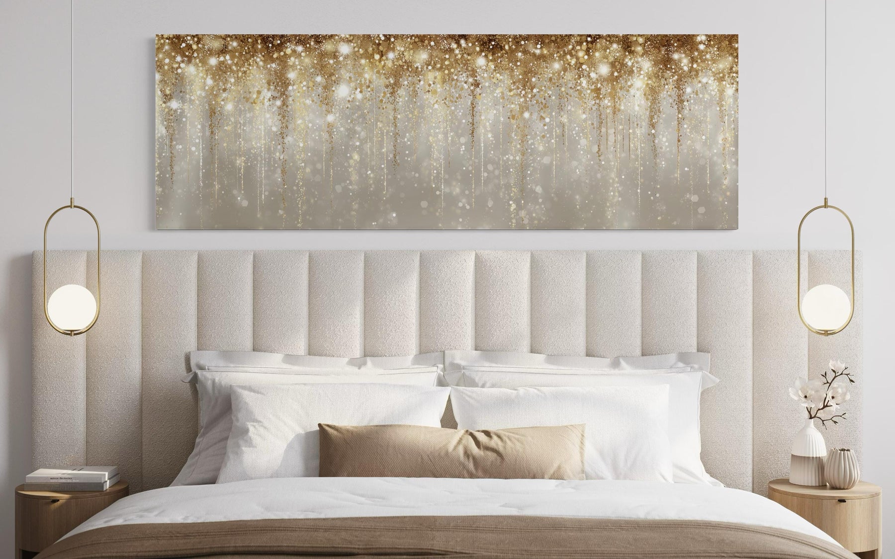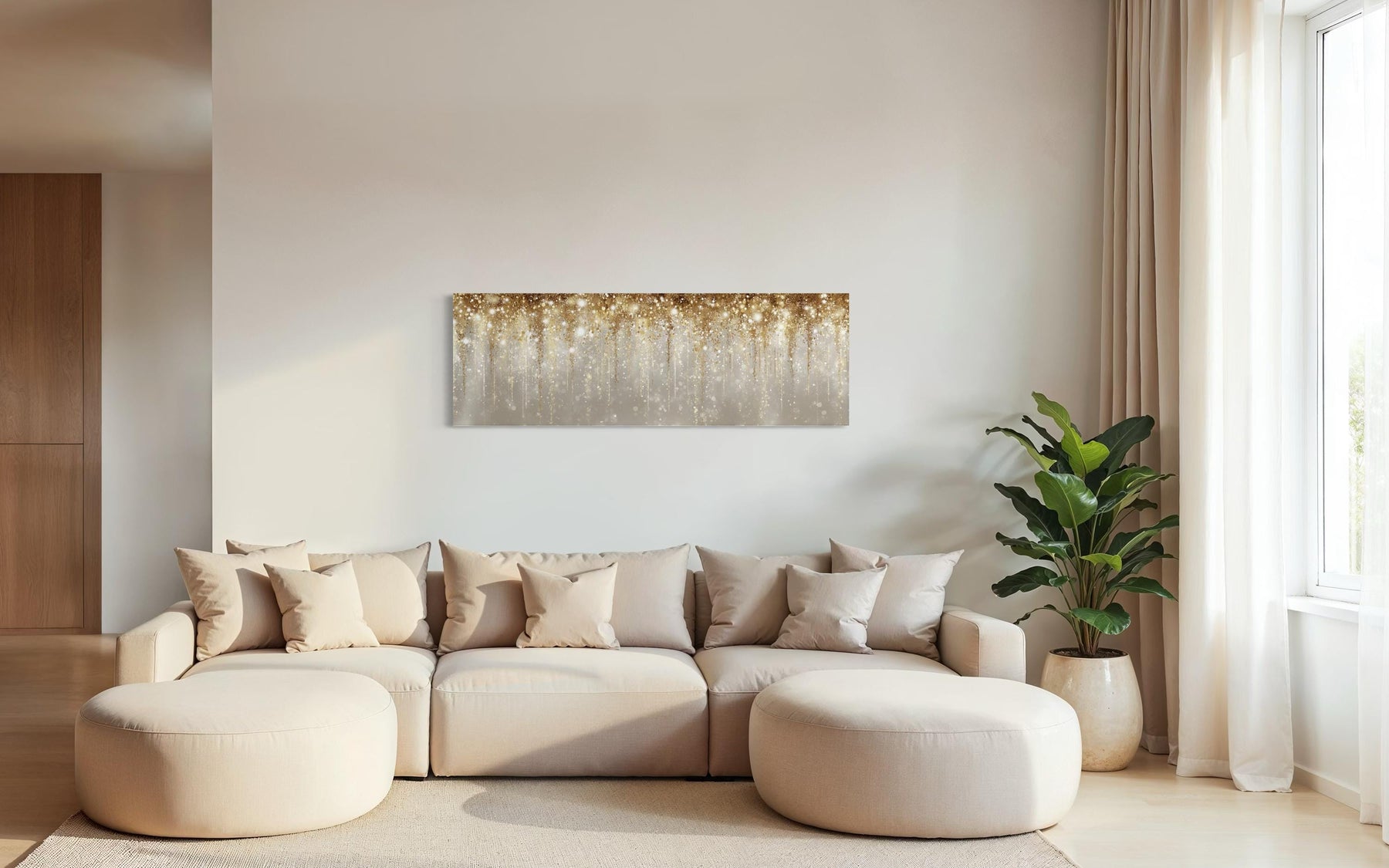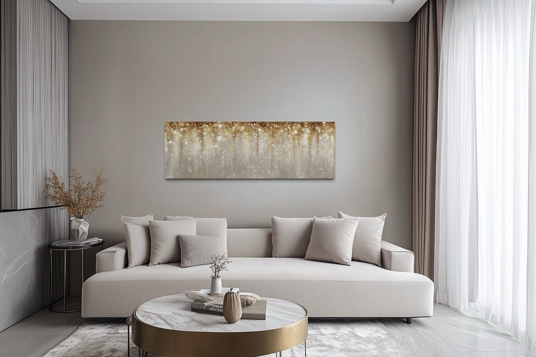 This elegant piece of white and gold abstract wall decor is particularly suited for soft, neutral modern bedrooms or serene living rooms. Its long horizontal format makes it perfect for hanging above a headboard, stretching gracefully across a king or queen bed. It also works effortlessly above a modern low-profile couch in a bright, softly lit sitting room. The neutral palette is ideal for interiors that favor white walls, ivory bedding, and touches of metallic or pale wood furniture. If your space is filled with plush textures—like boucle throws, linen curtains, and wool rugs—this wall art brings in that perfect final polish. The abstract design fits well in homes styled around minimalism, quiet luxury, or soft Scandinavian aesthetics. Its golden rain motif adds a poetic touch without overwhelming the space. For rooms with little color but plenty of texture and light, it serves as a soft yet opulent focal point. It’s ideal for those who seek relaxation and beauty in their interior design. The final impression is soft, luminous, and complete with this abstract canvas wall art.
