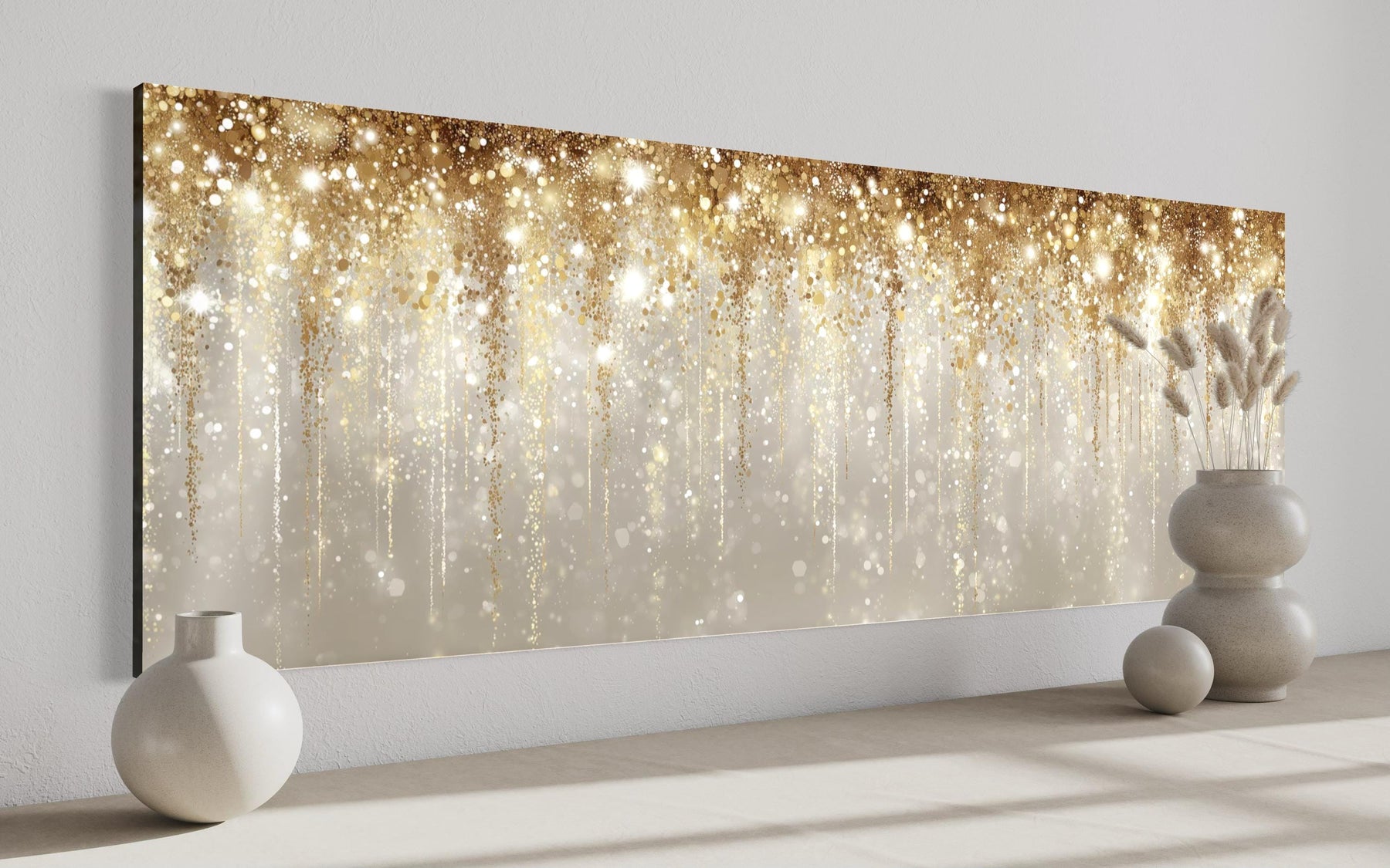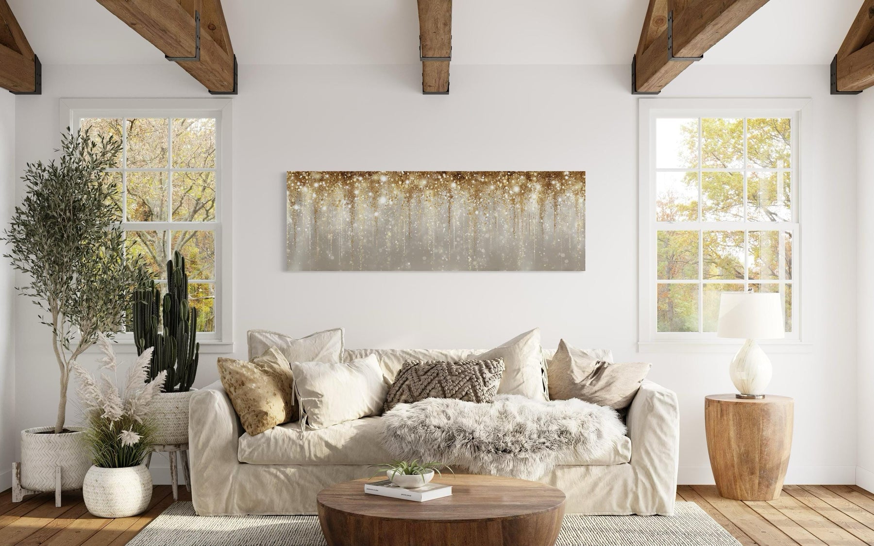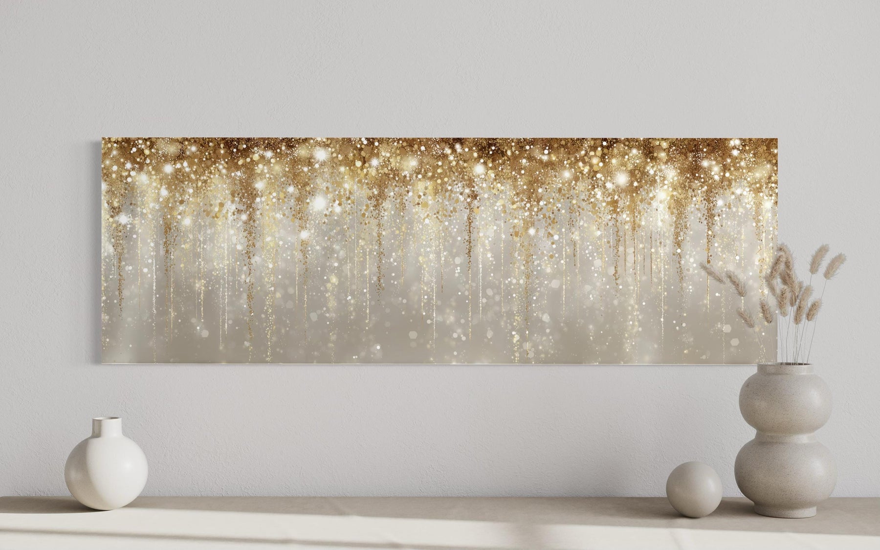 This elegant piece of white and gold abstract wall decor is particularly suited for soft, neutral modern bedrooms or serene living rooms. Its long horizontal format makes it perfect for hanging above a headboard, stretching gracefully across a king or queen bed. It also works effortlessly above a modern low-profile couch in a bright, softly lit sitting room. The neutral palette is ideal for interiors that favor white walls, ivory bedding, and touches of metallic or pale wood furniture. If your space is filled with plush textures—like boucle throws, linen curtains, and wool rugs—this wall art brings in that perfect final polish. The abstract design fits well in homes styled around minimalism, quiet luxury, or soft Scandinavian aesthetics. Its golden rain motif adds a poetic touch without overwhelming the space. For rooms with little color but plenty of texture and light, it serves as a soft yet opulent focal point. It’s ideal for those who seek relaxation and beauty in their interior design. The final impression is soft, luminous, and complete with this abstract canvas wall art.