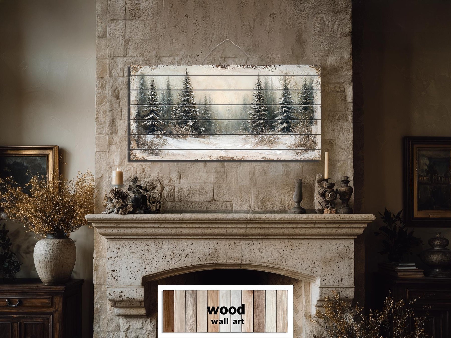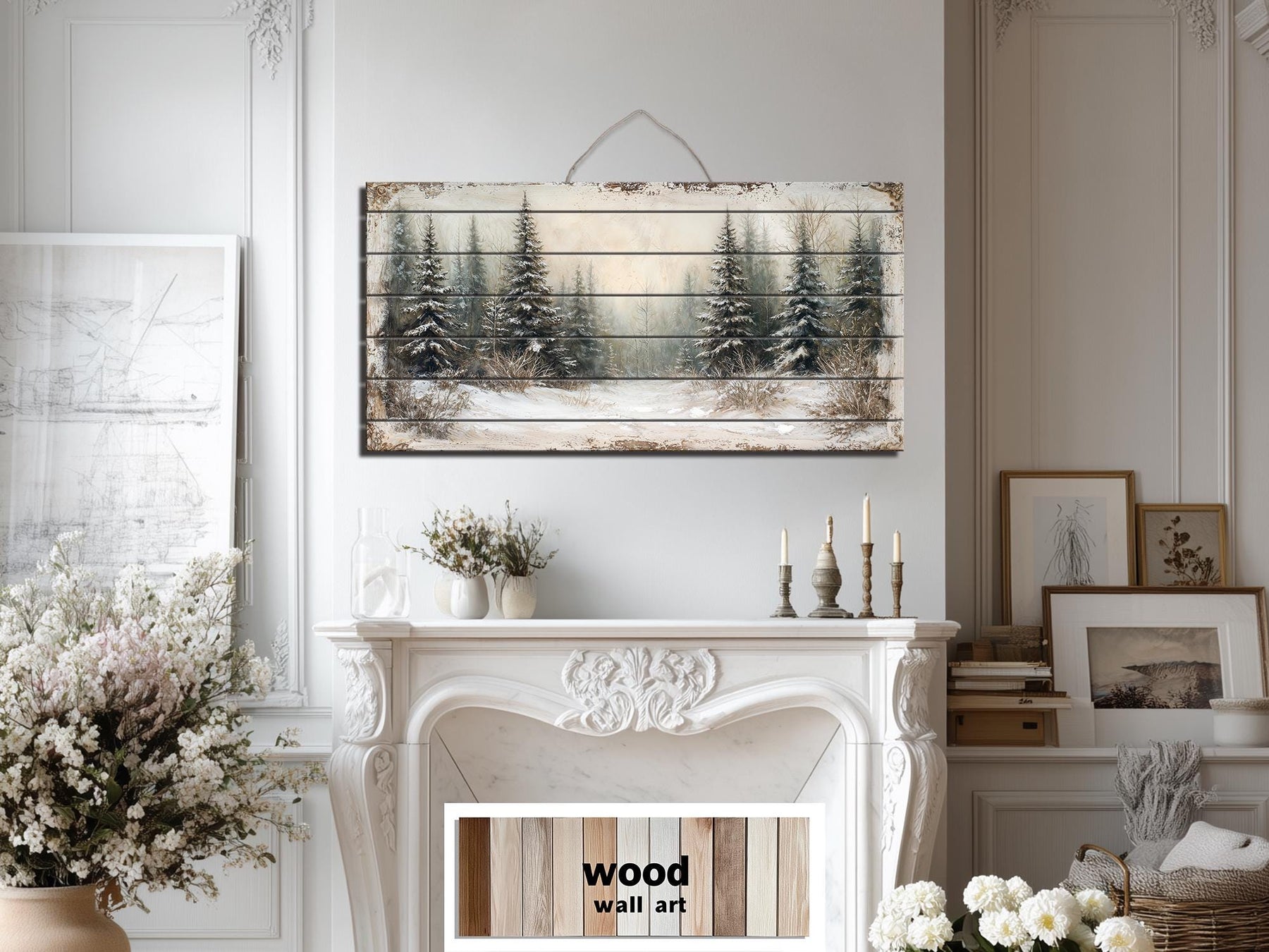 This snowy pine forest wall decor is perfectly suited for rustic lodge interiors or mountain cabin spaces where nature and simplicity define the aesthetic. Its weathered appearance and natural palette make it an ideal match for woodsy retreat homes or spaces inspired by winter getaways and alpine tranquility. Whether displayed above a fireplace mantel, hallway console, or wood-paneled wall, this piece complements raw textures like reclaimed timber, woven textiles, and stone surfaces. The artwork aligns beautifully with neutral-toned furniture, cozy knit blankets, vintage lanterns, and leather or linen accents commonly found in lodge and cottage interiors. For those curating a seasonal winter display, this painting acts as a serene anchor to snowy themes without feeling overly decorative or commercial. It’s also a beautiful year-round addition for those who appreciate the changing seasons and want to hold onto the peacefulness of winter landscapes. The distressed finish and natural tones feel at home in spaces styled with Scandinavian, farmhouse, or vintage outdoor influences. Its quiet sophistication offers a moment of stillness that balances more rugged or textured home elements. Those designing a warm and rustic sanctuary will find this piece fits in effortlessly. This pine forest painting on wood brings the essence of nature into your cabin or lodge-style space