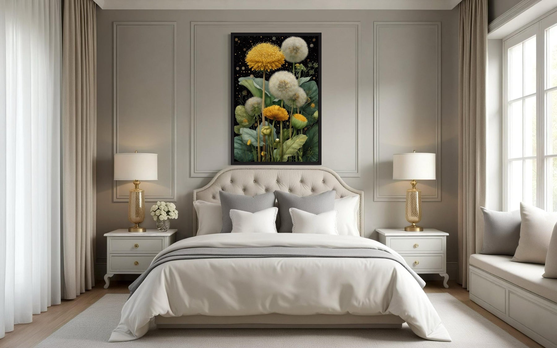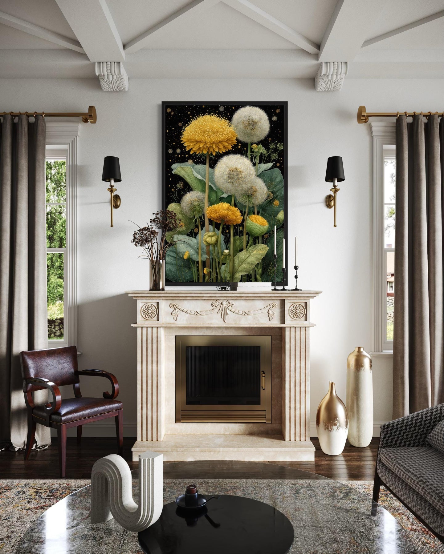 The Yellow Dandelion On Black Background painting showcases a vivid contrast of luminous yellows and rich dark tones. Bright sunflower and goldenrod yellows dominate the blossoms, with gentle amber highlights and soft lemon accents adding dimension and depth. Warm ivory and pale cream trace the delicate seed heads, bringing out the lightness of each airy wisp. The dramatic black background provides striking visual balance, intensifying the floral glow and enhancing every detail. Subtle hints of olive and muted green define the stems and leaves, offering natural grounding without distracting from the flowers’ brilliance. Fine touches of smoky gray and deep charcoal create smooth transitions between foreground and background, ensuring that the overall composition remains harmonious. Whether displayed in daylight or under warm interior lighting, these carefully chosen hues maintain their depth and elegance. The interplay of radiant yellows with the profound black backdrop gives the piece a bold yet refined energy. This sophisticated palette ensures that the Yellow Dandelion On Black Background Botanical canvas wall art remains eye-catching and stylish through every season.
