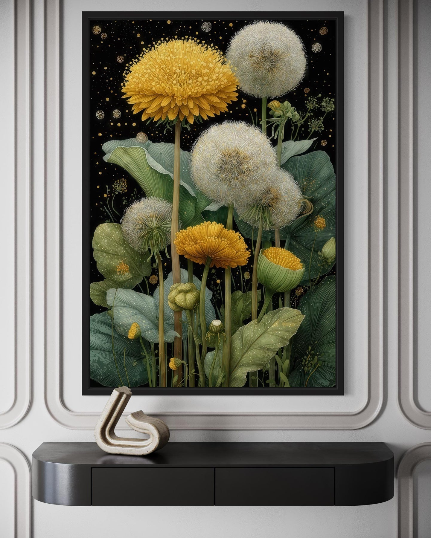 Our Yellow Dandelion On Black Background Botanical canvas wall art offers a dramatic blend of natural elegance and contemporary style, featuring golden dandelion blossoms glowing against a rich, dark backdrop. The detailed painting shows fully opened dandelions and delicate seed heads in various stages, their textures captured with fine brushstrokes that reveal every petal and wisp. Set against a deep black background, the luminous yellow flowers seem to float, giving the composition striking contrast and depth. This vertical canvas print emphasizes the beauty of botanical forms while presenting them with modern sophistication. The dandelion’s symbolic themes of wishes, renewal, and natural resilience add subtle meaning to its visual appeal. Every line and shade is faithfully reproduced on premium canvas, ensuring that the artwork maintains its brilliance and texture over time. Whether admired for its artistry or its quiet symbolism, this Yellow Dandelion wall decor brings a sense of wonder to everyday interiors. Ready to hang and built for enduring quality, it delivers a perfect mix of bold statement and calming detail. Ending with timeless charm, the Yellow Dandelion On Black Background Botanical canvas print becomes a lasting highlight in any nature-inspired art collection.