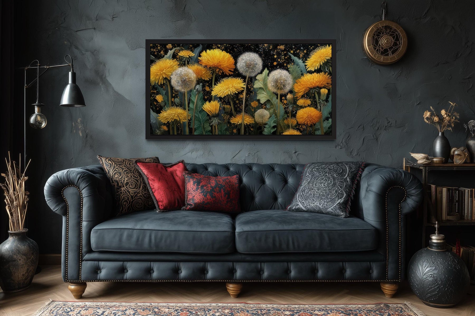 This Yellow Dandelions On Dark Background canvas wall art is perfect for modern living rooms and contemporary dining spaces that embrace bold, nature-inspired design. Its dramatic floral imagery pairs beautifully with sleek furniture, clean lines, and neutral palettes, adding a burst of natural color and artistic texture. In a living room, it serves as a statement piece above a sofa or fireplace, catching the light and instantly energizing the space. In a dining area, it creates a warm and inviting mood, harmonizing with wooden tables and soft fabrics while offering a sophisticated contrast to minimalist settings. The balanced composition makes it equally striking when paired with other botanical artworks or displayed alone as the room’s centerpiece. High-quality canvas printing ensures that every vivid detail stays crisp and brilliant for years to come. The Yellow Dandelions On Dark Background painting brings the freshness of spring and the elegance of fine art into everyday life. Whether your home style leans urban chic or modern rustic, this piece bridges natural beauty with contemporary flair. Complete your interior with the radiant glow of Yellow Dandelions On Dark Background wall art.